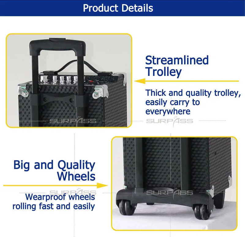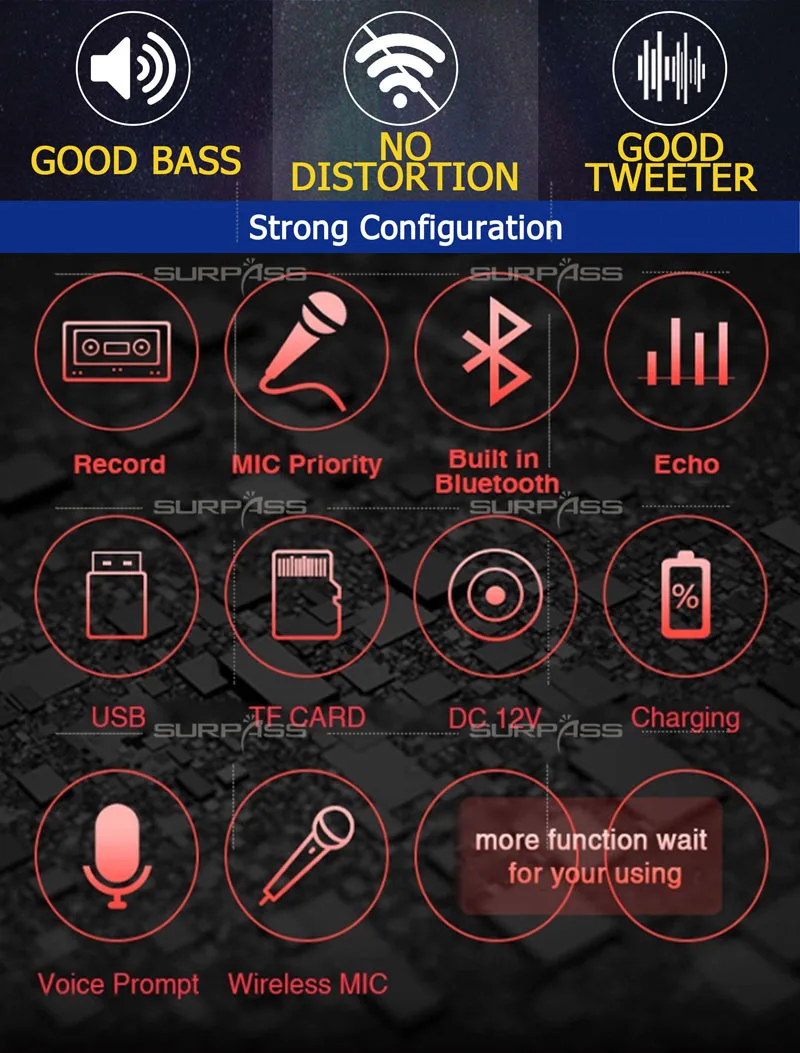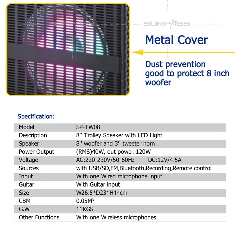 ● 8-дюймовый бас + 3-дюймовый тройник ● Четкие звуковые слои ● Подходит для нескольких случаев ● 40 Вт RMS и 120 Вт P. M. P. O. ● Встроенный 12V4.5A аккумулятор, также доступен для внешнего источника питания ● С входом USB/SD, с bluetooth, радио, входом AUX, пультом дистанционного управления ● Входной разъем микрофона * 1 с эхо, настраивается независимо ● Входной разъем для гитары * 1, регулируется независимо ● С большими колесами и drawbar ● С одним беспроводным микрофоном.