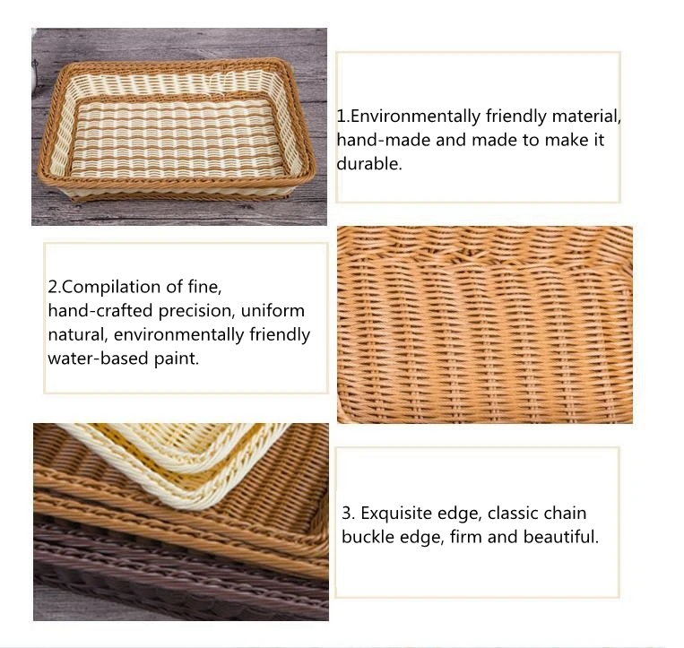 1. Название: Корзина для фруктов и овощей 2. Материал: пластмассовая лоза 3. Объем: овощи, фрукты, хлеб 4. Размер: S: 30*20*7 см; M: 35*25*7 см; L: 40*30*8 см; XL: 45*35*8 см; XXL: 50*35*8 см 5. Цвет: как показано 5. В комплект входит: 1 × корзина для фруктов и овощей