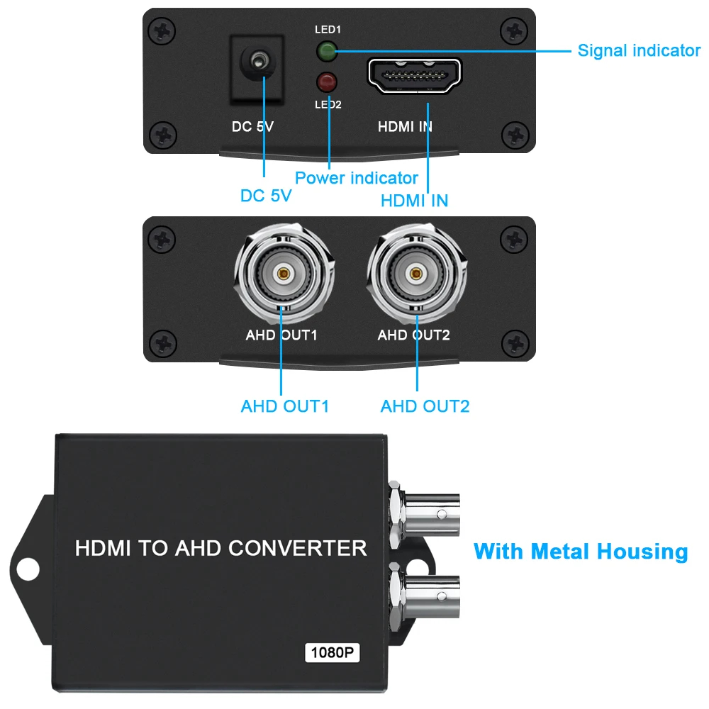 В верхней части изображения находится источник подключения HDMI к видео, с блоком питания 5 в постоянного тока. Светодиодный сигнал 1 указывает на видеосигнал. Светодиодный индикатор 2 указывает, что блок питания включен. Видеовход HDMI на обратной стороне имеет два видеовыхода BNC. Оба выхода AHD видео с разрешением 1080p.