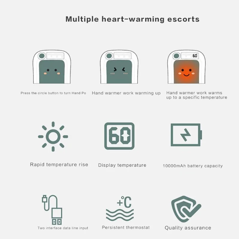 2. Поддерживает длительную лихорадку-3 секунды быстрой лихорадки. Есть 3 вида 40 ℃ / 50 ℃ / 60 ℃ температуры дисплея, вы можете регулировать температуру в соответствии с вашими потребностями, 6 часов при 40 ℃, 8 часов при 50 ℃, 10 часов при 60 ℃, большинство теплых рук на рынке может работать только на 4 часа. Одна зарядка занимает 3-6 часов для всей зарядки.