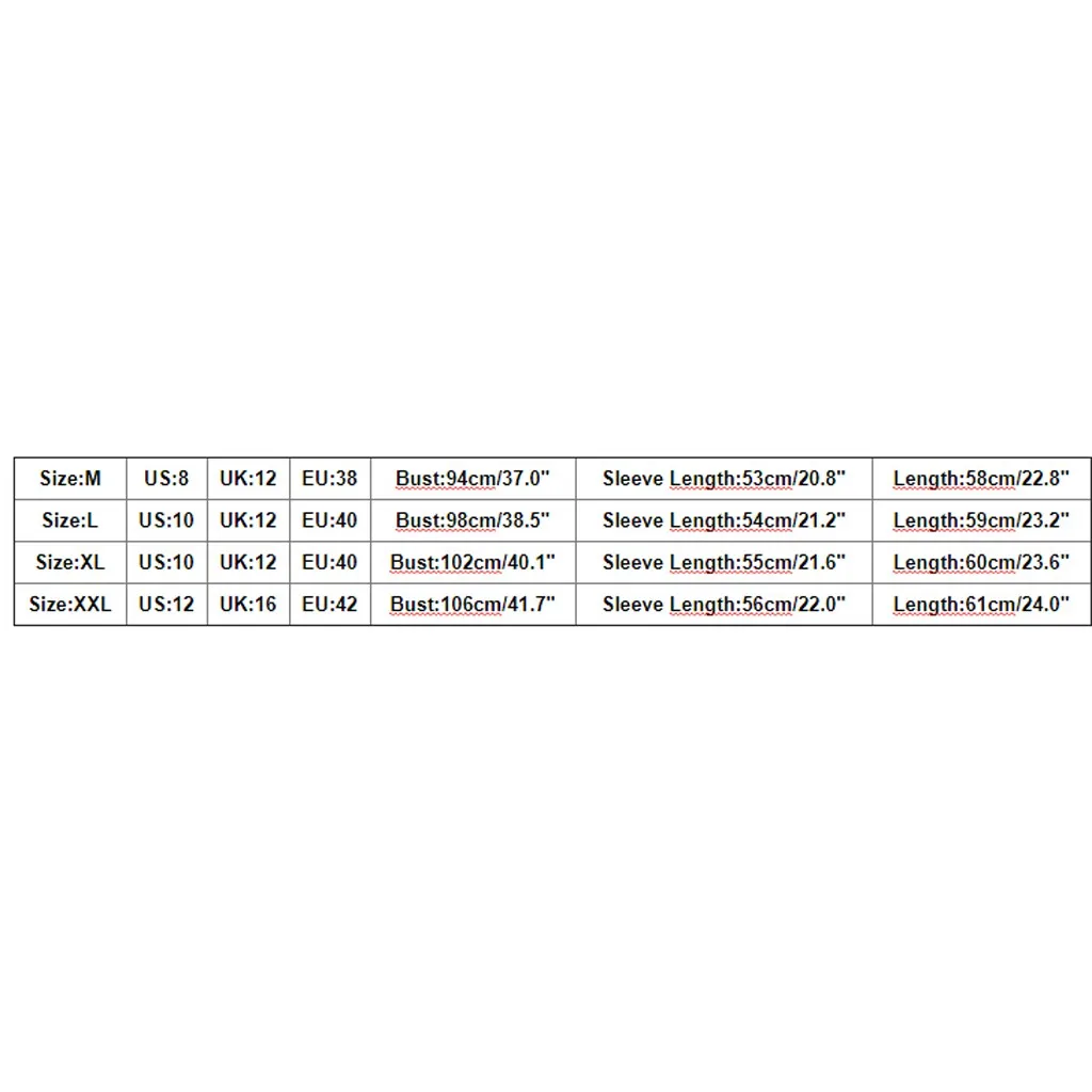Размер США Великобритания ЕС Бюст Длина рукава Длина М 8 12 38 94 см/37,0" 53 см/20,8" 58 см/22,8" L 10 12 40 98 см/38,5" 54 см/21,2" 59 см/23,2" XL 10 12 40 102 см/40,1" 55 см/21,6" 60 см/23,6" XXL 12 16 42 106 см/41,7" 56 см/22,0" 61 см/24,0"