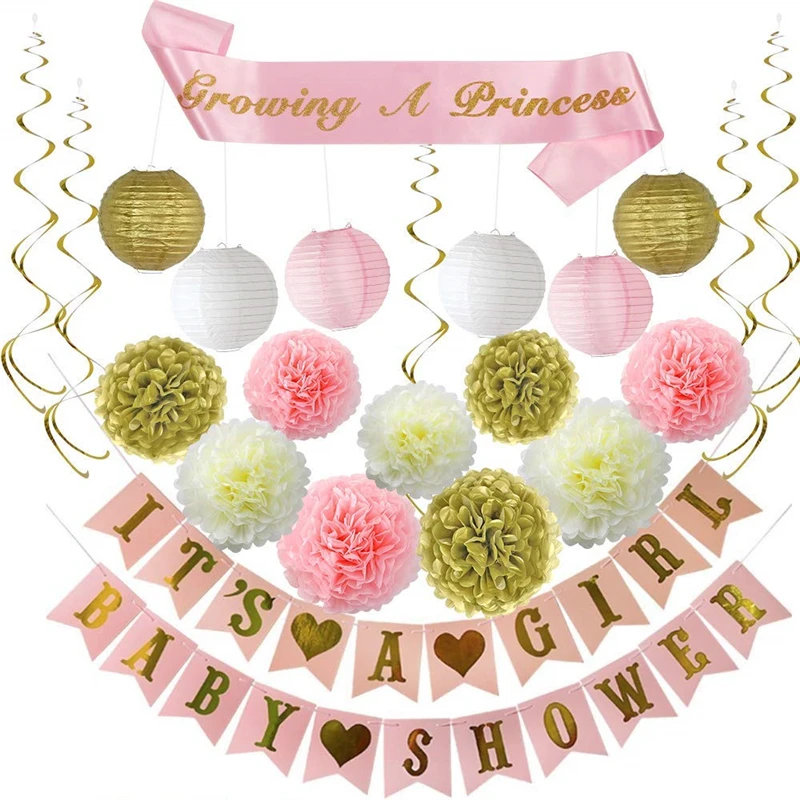 Баннер для душа для девочек 3 шт 8 дюймов бумажные помпоны Комплект из 3 предметов, 10 дюймов Бумага Pom poms 3 предмета в комплекте 12 дюймов Бумага Pom poms 6 шт 8 дюймов Бумага фонари 5 шт. спираль кулоны из нержавеющей стали 1 шт. розовый пояс сатин