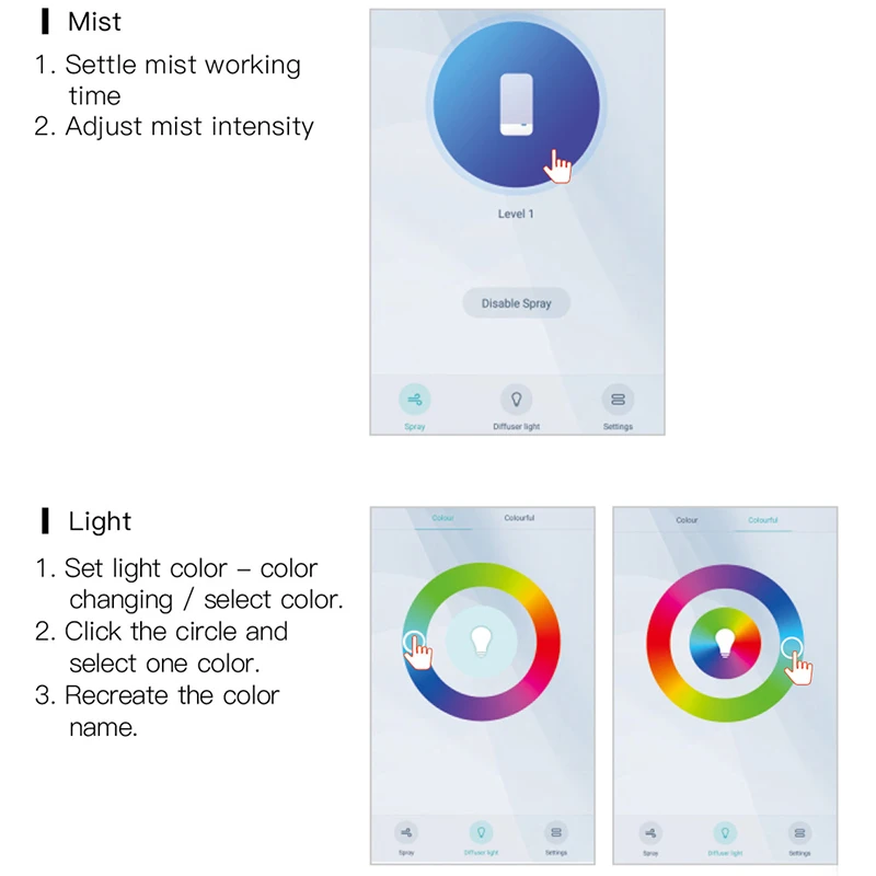 М (туман): 1-й пресс режим низкого тумана 2-й режим сильного тумана 3-й пресс стоп туман L (светильник): 1-й пресс Включите светильник (7 Красочный ночной Светильник) 2-е нажатие настройки на указанный цвет Держите Пресс отключения Примечание: фактический заказ освещения основан на физическом объекте.