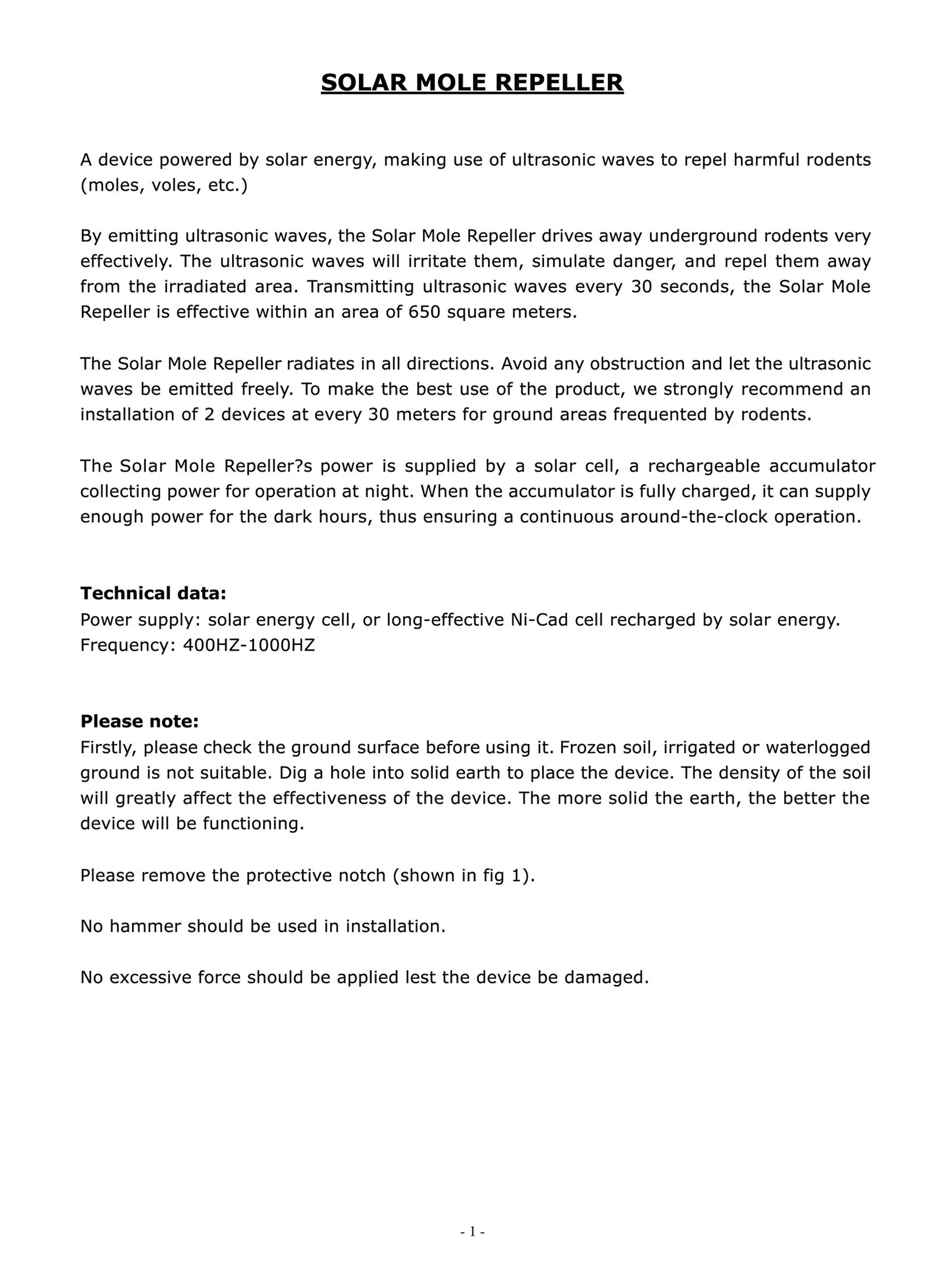Примечание: Перед использованием проверьте поверхность земли. Грунт frozenn, орошаемый или водяной грунт не подходит. Выкопайте отверстие в твердую землю, чтобы разместить устройство. Плотность почвы значительно повлияет на эффективность устройства. Чем прочнее земля, тем лучше устройство будет работать.