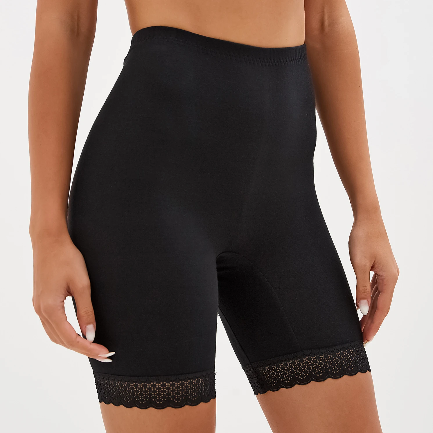 Панталоны из эластичного трикотажного полотна. Завышенная линия талии. Корректирующие зоны на передней, боковой и задней деталях модели. Верх уплотнен широкой эластичной лентой. Отделка – узкое эластичное кружево по низу изделия.