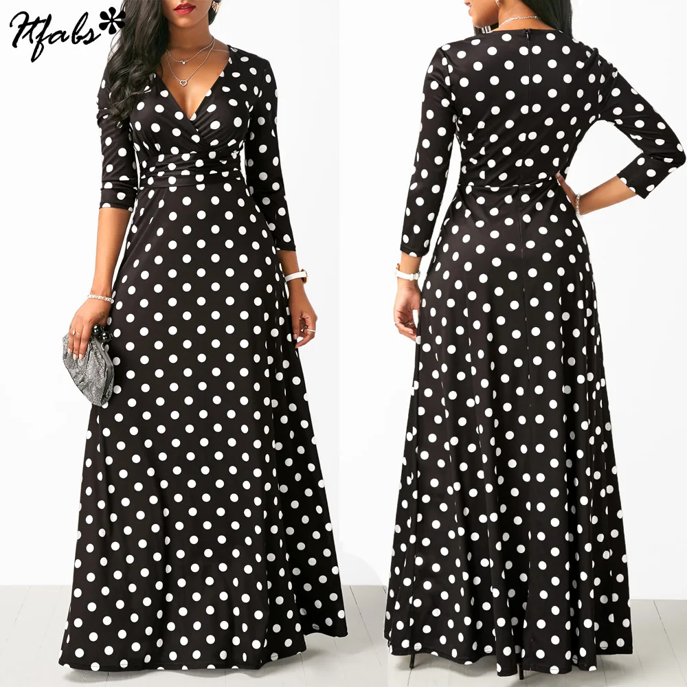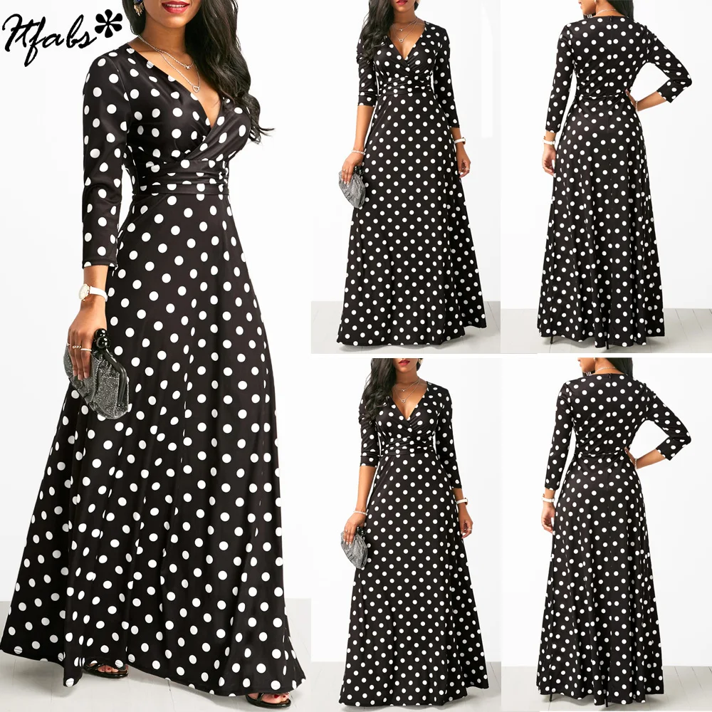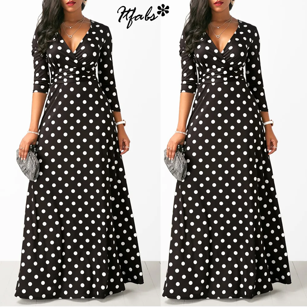 Женское черное платье макси в горошек с высокой талией!