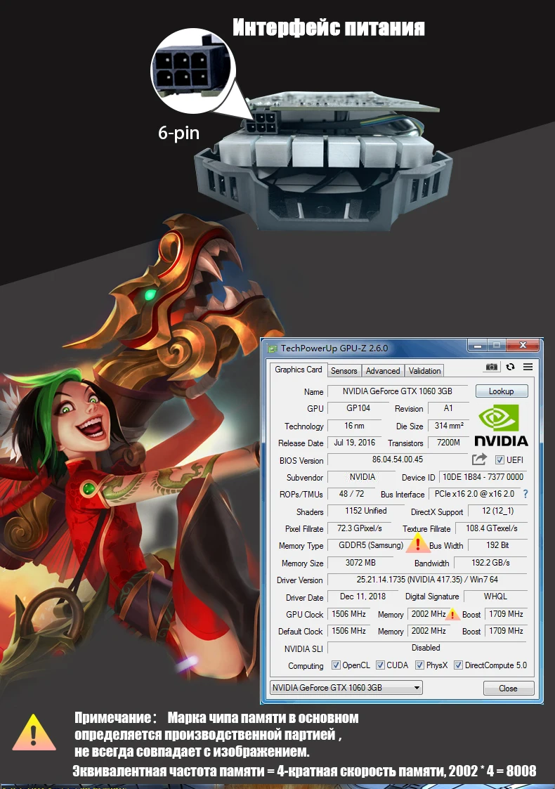 Описание товара: 1.100% оригинальный чипсет GTX 1060 2.100% протестированная работа перед отправкой 3.100% Оригинал 3 ГБ GDDR5 192 бит 4. Частота сердечника: 1506 5. Частота памяти: 8008 МГц 6. Максимальное разрешение: 7680 × 4320 7. Тип интерфейса: PCI Express 3,0 16x 8. Тип выходного интерфейса: DP HMI DVI-D 9. Microsoft Direct X: DirectX 12 OpenGL 4,5 10. Разъем питания: 6 pin 11. Рекомендуемая мощность: 400 Вт выше