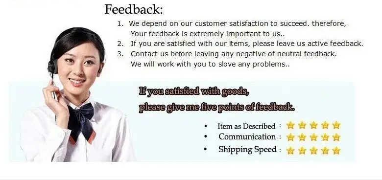 1. Пожалуйста, оставьте 5 звезд отзывы, если вы удовлетворены нашей продукцией и обслуживанием, Мы будем признательны (товар, как описано 5 звезд, связь 5 звезд, время доставки 5 звезд).