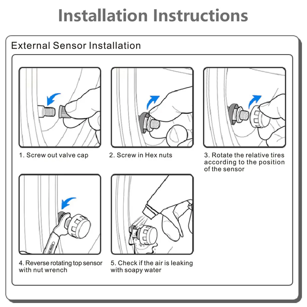 Параметры, которые могут быть изменены путем установки: Температурный блок (Цельсия/Фаренгейт), блок давления в шинах (PSI/бар), сигнал тревоги высокой/низкой температуры, сигнал тревоги высокого давления/низкого давления