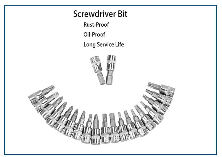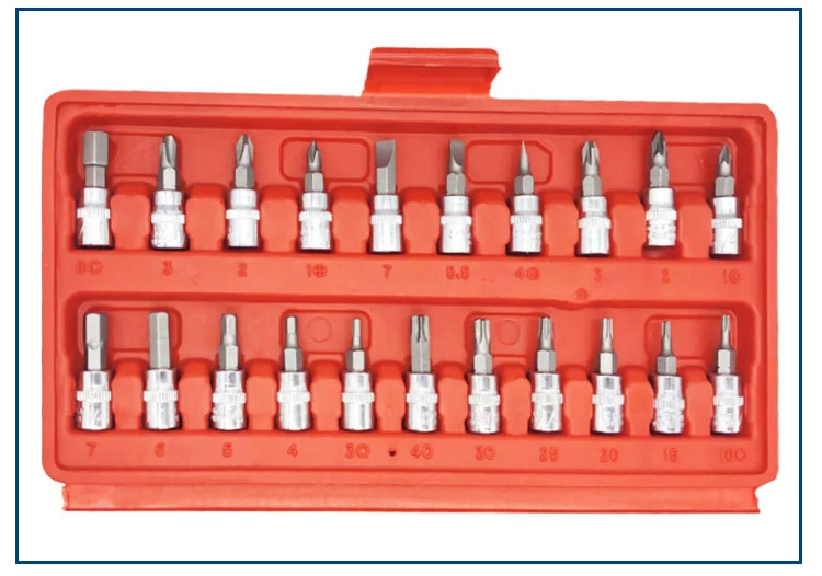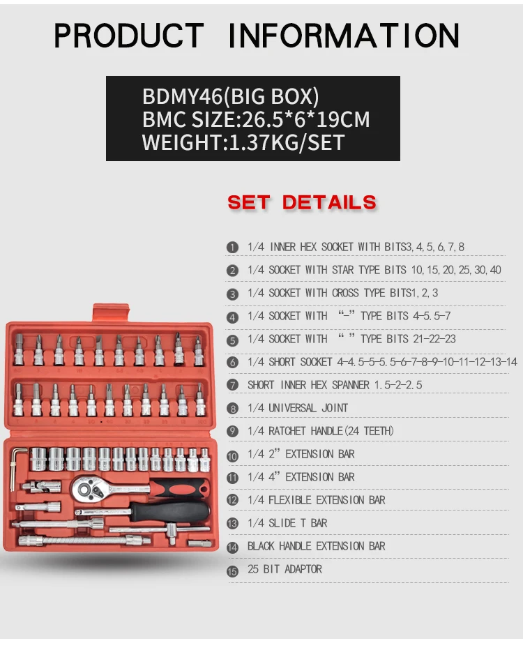 Технические характеристики 1/4 внутренний шестигранный разъем с bits3, 4,5, 6,7, 8 1/4 гнездо со звездами типа биты 10,15, 20,25, 30,40 1/4 гнездо с перекрестными типами бит 1,2, 3 1/4 гнездо с "-" типом бит 4-5,5-7 1/4 гнездо с «» типом бит 21-22-23 1/4 короткое гнездо 4-4,5-5-5,5-6-7-8-9 лет 10-11-12-13-14 Короткий внутренний шестигранный ключ 1,5-2-2,5 1/4 универсальный шарнир 1/4 трещоточная рукоятка (24 зубы) 1/4 2 ”удлинитель 1/4 4 ”удлинитель 1/4 Гибкая удлинительная панель 1/4 слайд т бар Черная ручка удлинитель 25bit адаптера переменного тока Размер BMC: 23,5*4*12 см Вес: 1,2 кг/компл.