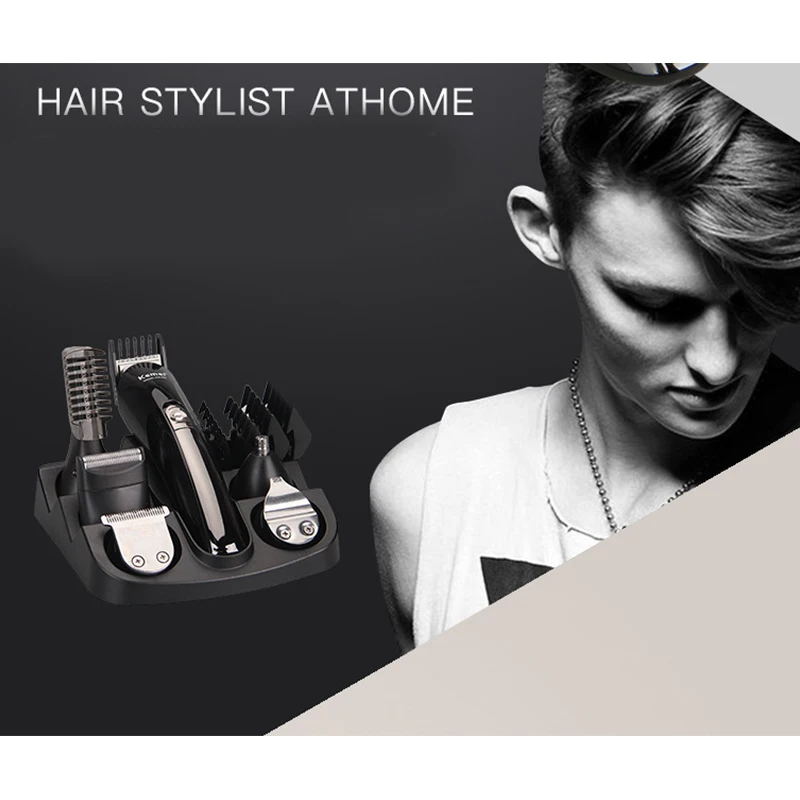 1 x Основная машинка для стрижки волос, 5 x Сменная головка, 5 x направляющая расческа, 1 x кабель питания, 1 x подставка, 1 x Расческа, 1 x маленькая щетка, 1 x руководство на английском языке