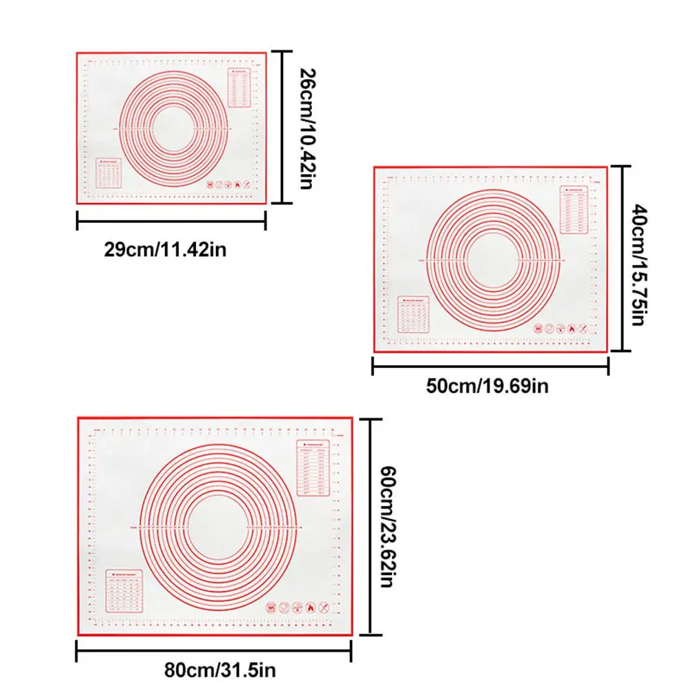 Характеристики (прибл.): Название: силиконовый коврик Размеры и вес: 26*29 см/10,24 * 11.42in, 40 г 40*50 см/15,75 * 19.69in, 100 г 60*80 см/23,62 * 31.5in, 260 г Материал продукта: пищевой силикон Термостойкая температура:-40-230 °C