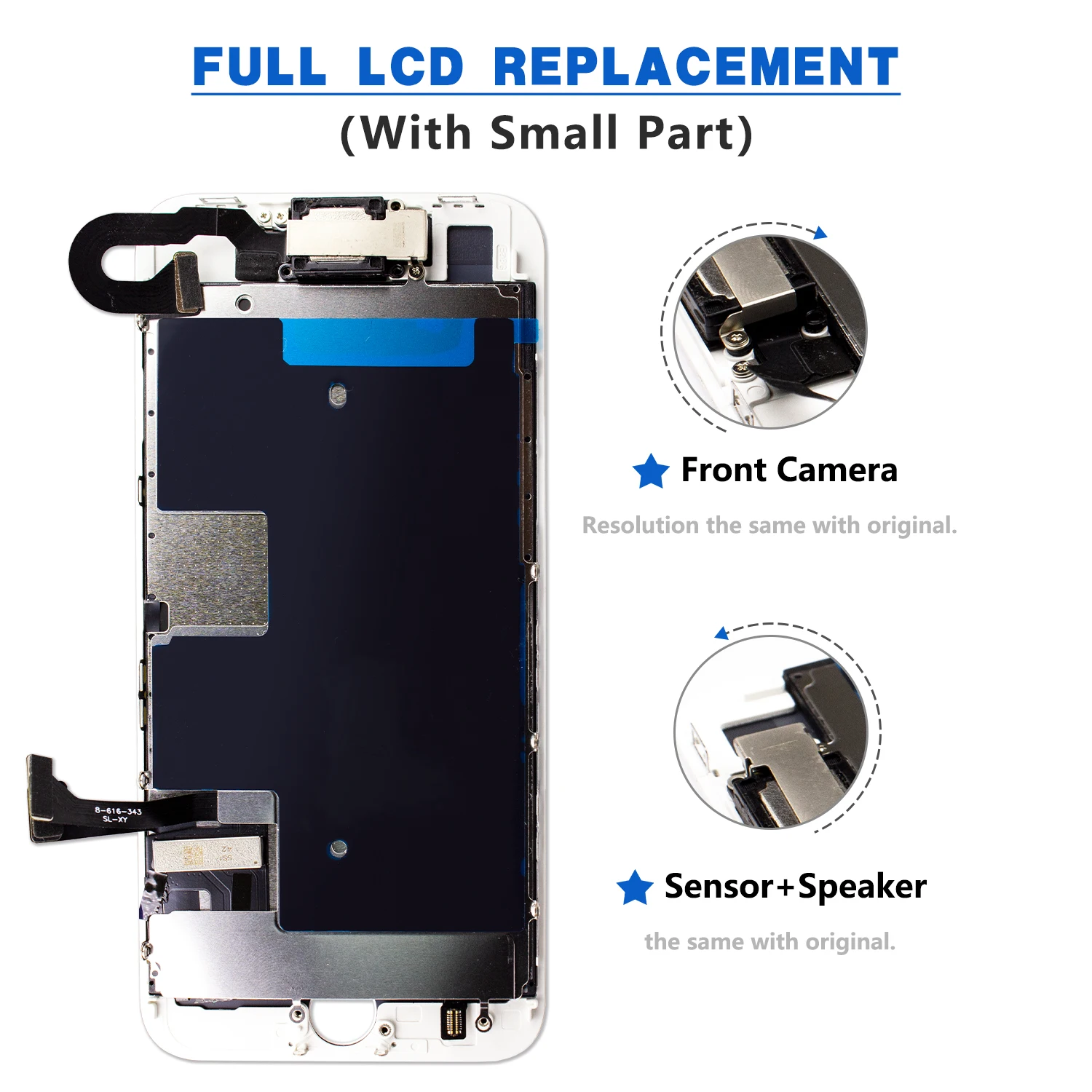 1. комплектация: внешнее стекло + сенсорный дигитайзер + ЖК-экран + средняя рамка + держатель передней камеры + Передняя камера + держатель датчика + сетка для динамиков + ЖК-металлическая пластина, сборка, сменный дигитайзер и сенсорная сборная экран для iPhone 7, 7plus 8 8 Plus