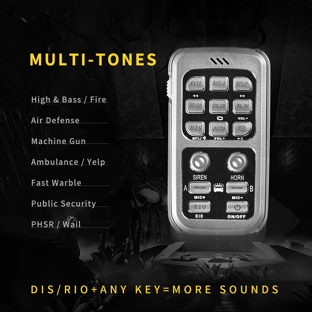 В основном это может сделать 8 звуков сирены, включая YELP, WAIL, HI-LO, CO-CO, WA-WA, авто, бесшумный, а также ручной рог и сирена. Кроме того, «DIS» + любой ключ может переключаться на один тон и двойной тон; «RIO» + любой ключ может переключаться на высокий и бас.