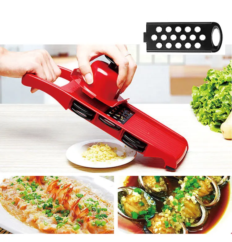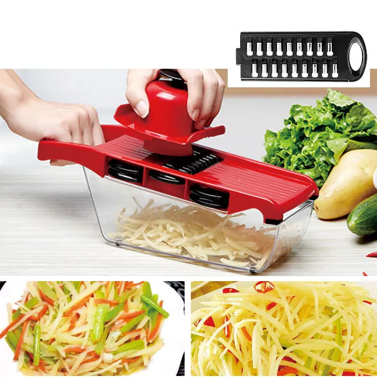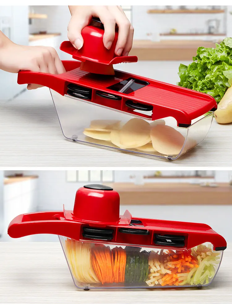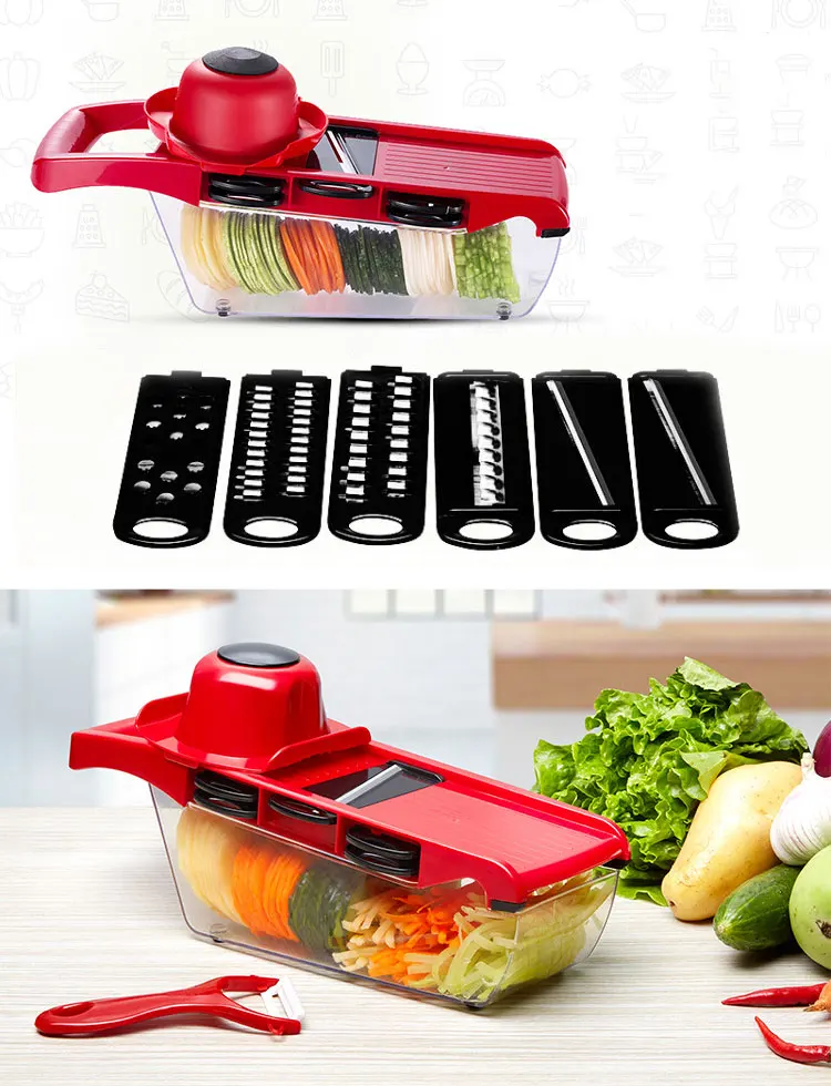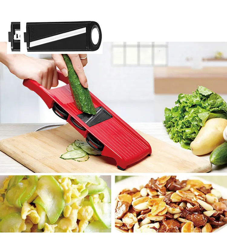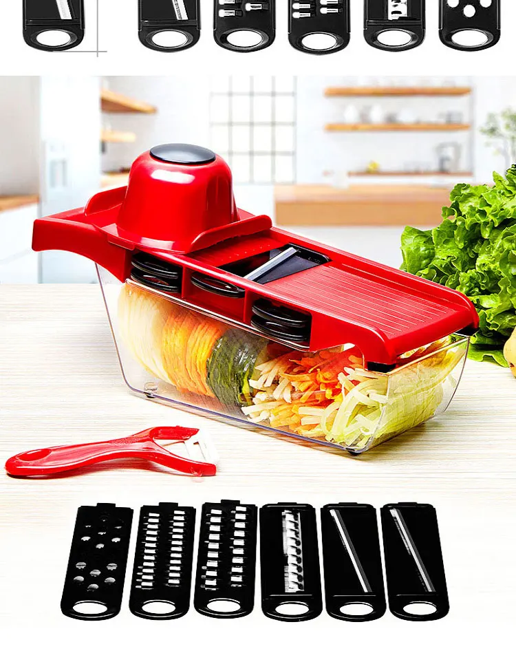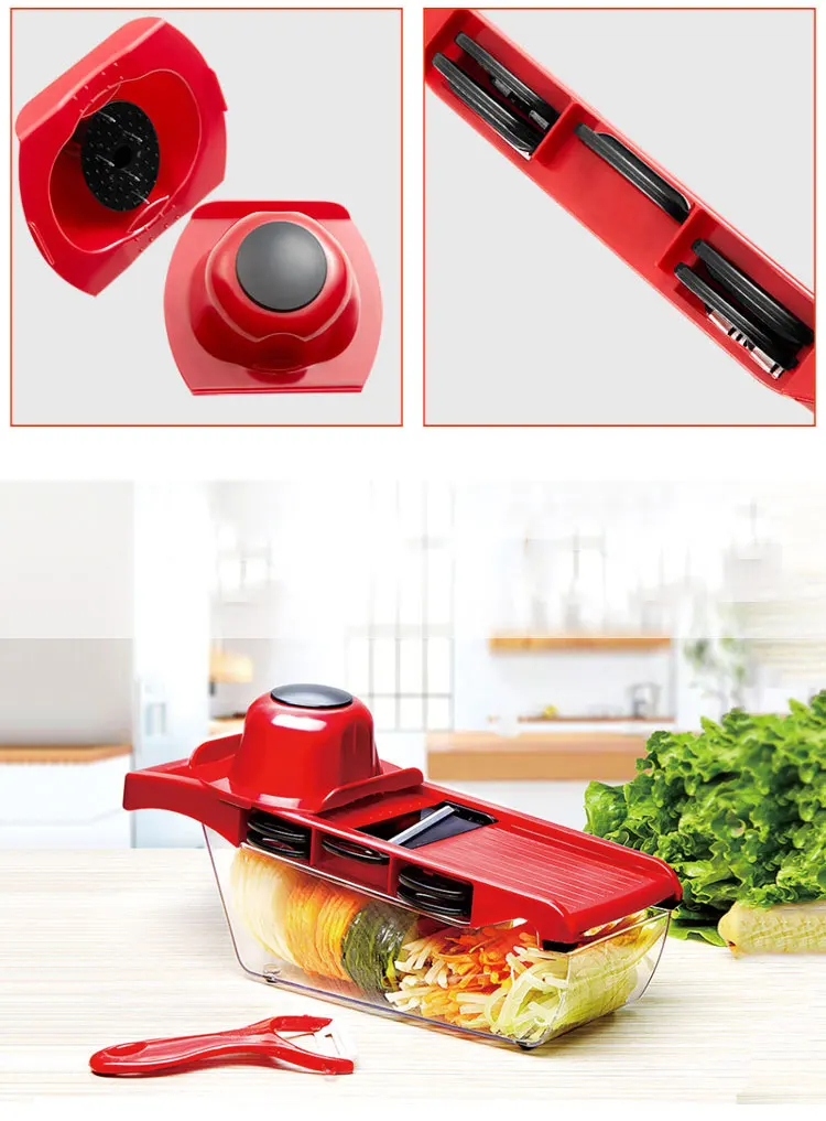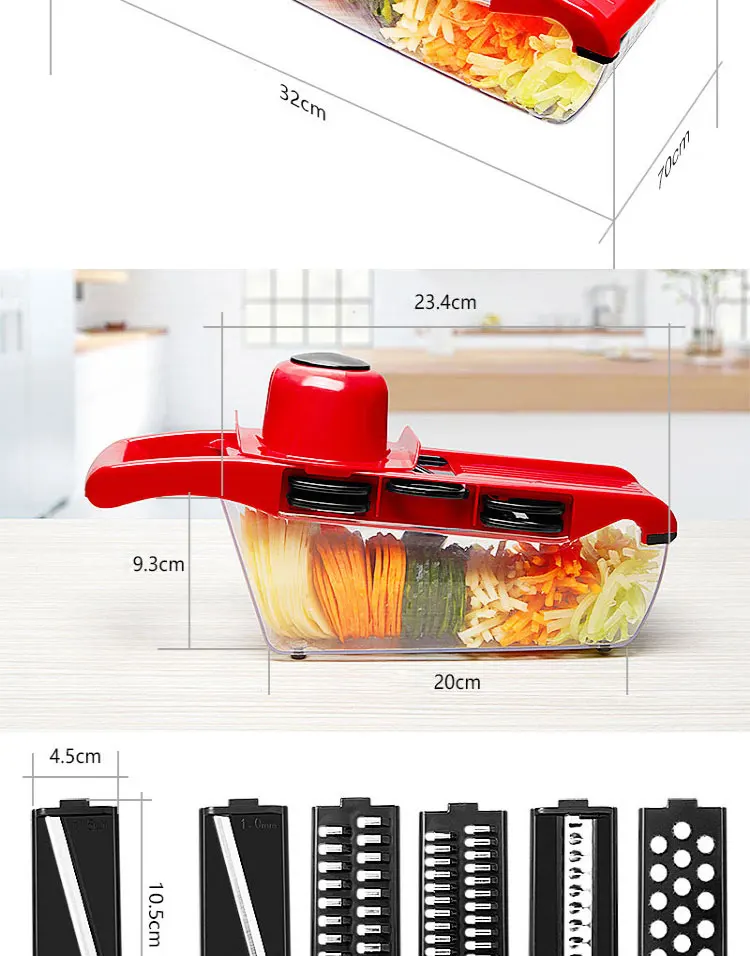 Кухонный помощник:Этот ручной слайсер изготовлен из пищевой нержавеющей стали и АБС-пластика без BPA. Он предлагает все функциональные возможности нескольких приборов со сменными нержавеющими лезвиями. Эти лезвия можно разрезать через все виды овощей, терка сыра, нарезка картофеля и резки фруктов, даже можно создать пастообразные овощи или пюре.