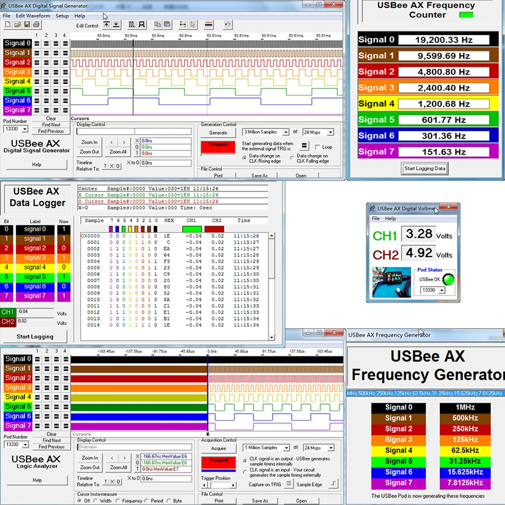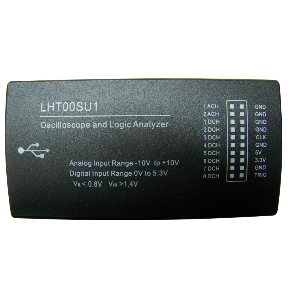 Функции: Двойной вход осциллографа (одноканальный, 16 Мбит/с, 3 МГц полоса пропускания), 8-канальный видеорегистратор для анализатора логики, регистратор данных, двухканальный вольтметр, осциллографа смешанных сигналов и анализатора логики, частотомер, пульта дистанционного управления, PWM контроллер, генератор частоты, I2C контроллер, Импульсный/краевой счетчик.