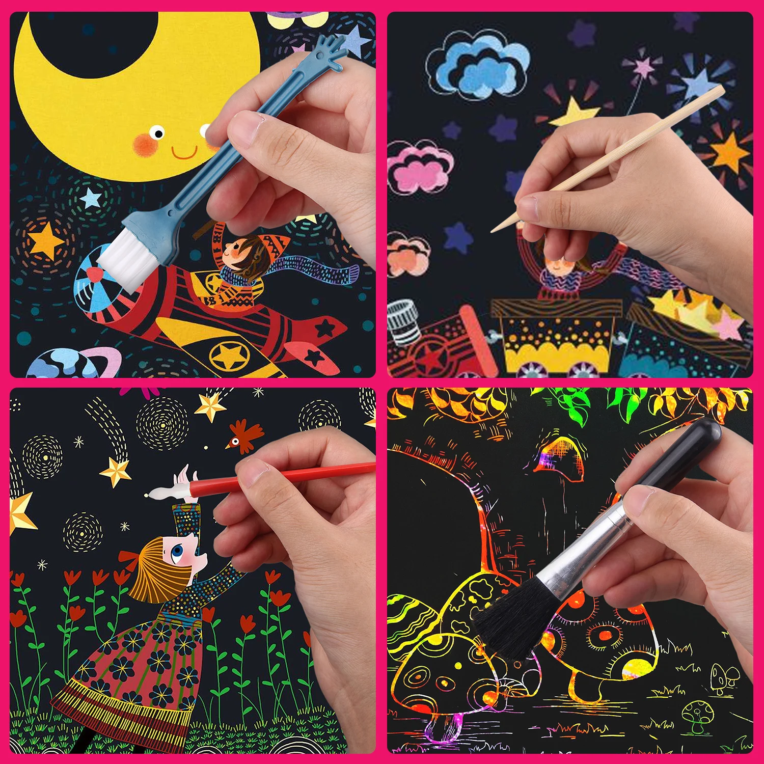 Простота в использовании:Ручка с царапинами и бамбуковая палочка наносятся на черную поверхность картонных досок и показывают радужные цвета; Скребок наносится на тонкие штрихи на скребок; Кисть наносится на очистку поверхности.