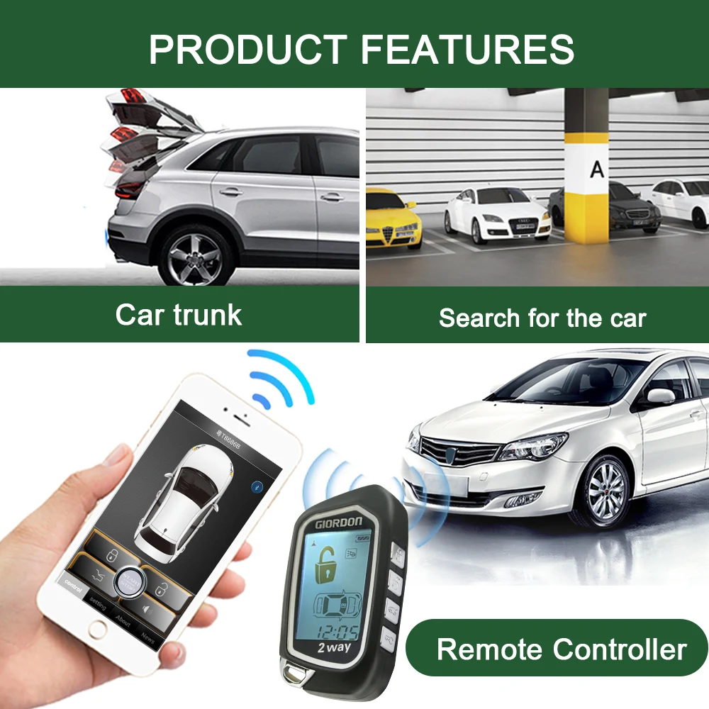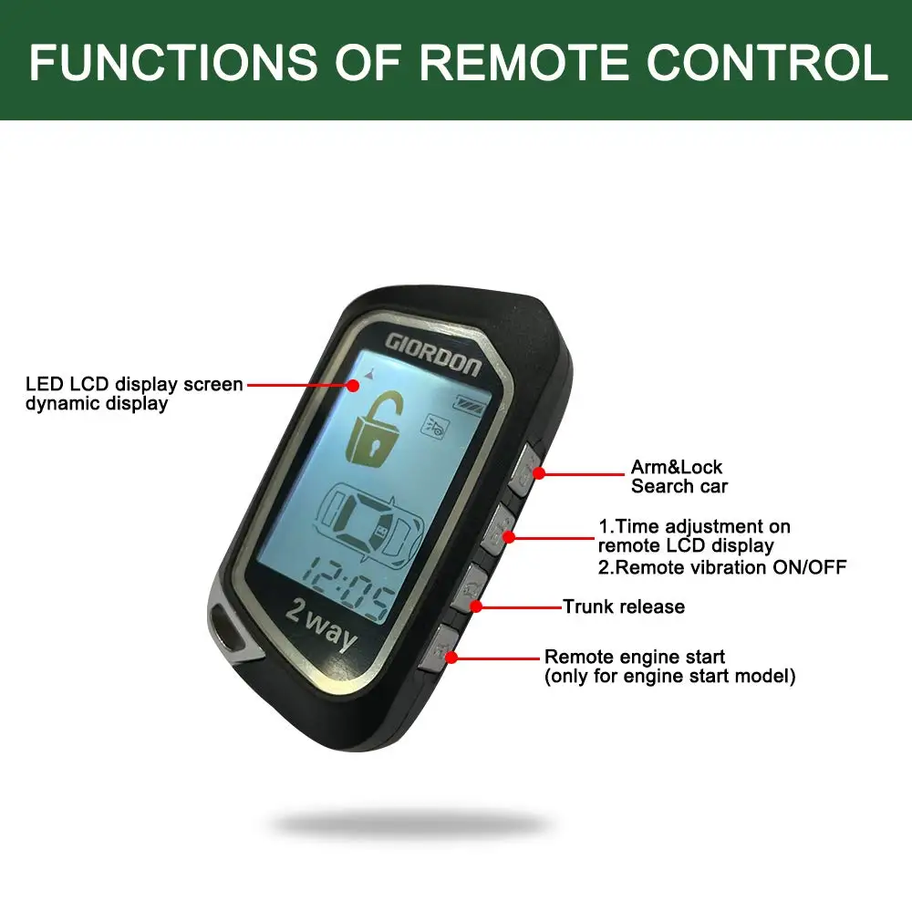 Это Двусторонняя Автомобильная сигнализация с ЖК-экраном, которая может дистанционно управлять запуском и остановкой двигателя, таймером запуска двигателя и датчиком вибрации. Этот продукт подходит для 95% бензиновых автомобилей DC12V на рынке. Продукт поставляется с инструкциями пользователя и схемами проводки на английском и русском языках.