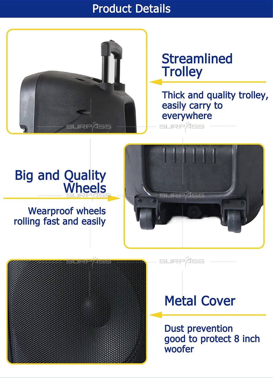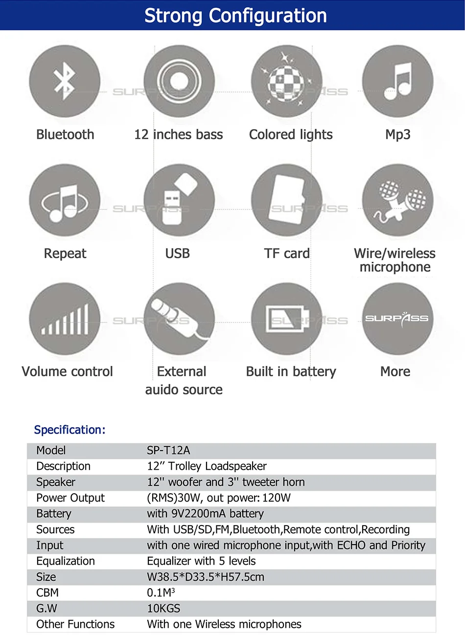 ● 12 дюймов сабвуфером * 1 + 3 дюймов ВЧ * 2 ● Ясный звук слоя ● Подходит для нескольких случаев ● 30 Вт RMS и 120 Вт P.M.P.O. ● Встроенный аккумулятор 9V2200mA ● Вход USB/TF, с bluetooth, радио, голосовые подсказки, дистанционное управление, запись, аудиовход ● Выравнивание с 5 уровнями ● Входной разъем для микрофона * 1 с приоритетом микрофона ● С одним беспроводным микрофоном.