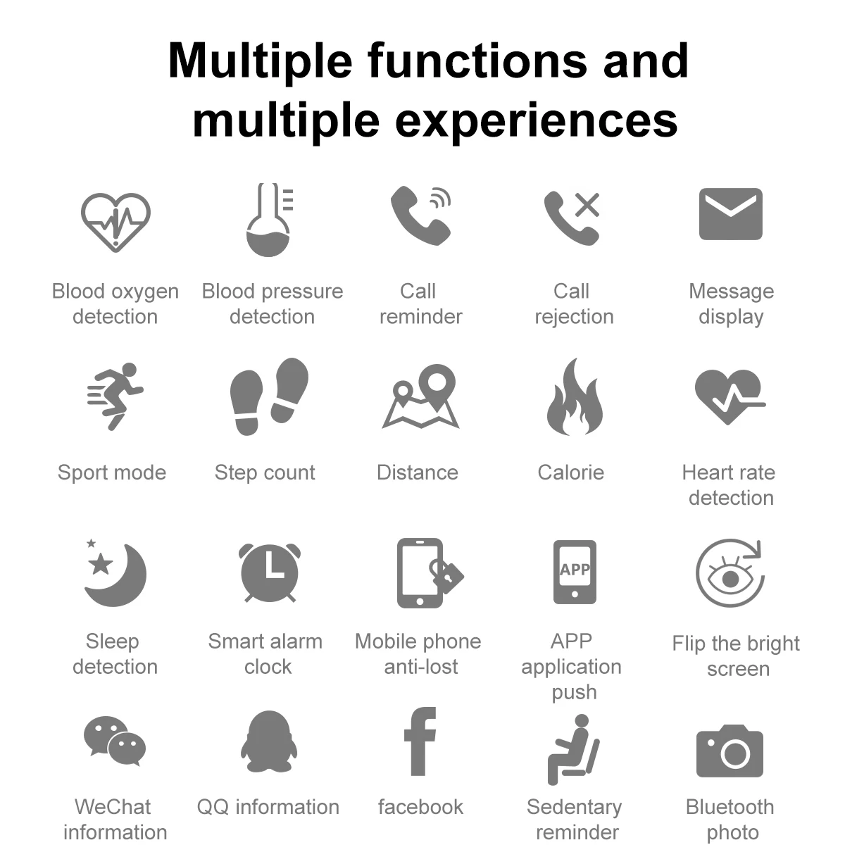A4.вызов напоминание толчок, SMS напоминание толчок, WeChat напоминание толчок, QQ напоминание толчок, Спортивная запись (шаг, пробег и т. д.), трек-карта, мониторинг сна, Сидячий напоминание, расчет калорий, секундомер, напоминание о низком аккумуляторе, ручной экран, быстрая зарядка, Ультра низкое энергопотребление, частота сердечных сокращений, Кровяное давление, вибрация, режим движения, удаленная фотография, управление музыкой, умная сигнализация, динамическая частота сердечных сокращений, большой экран высокой четкости, многофункциональный переключатель, WeChat sports