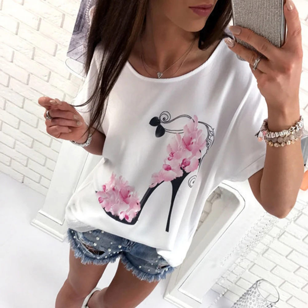 Модная Летняя женская футболка с цветочным принтом на высоком каблуке; Футболка с короткими рукавами и круглым вырезом