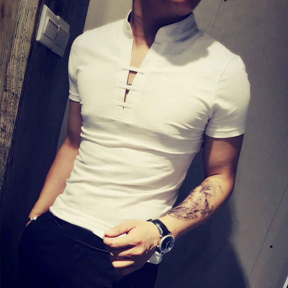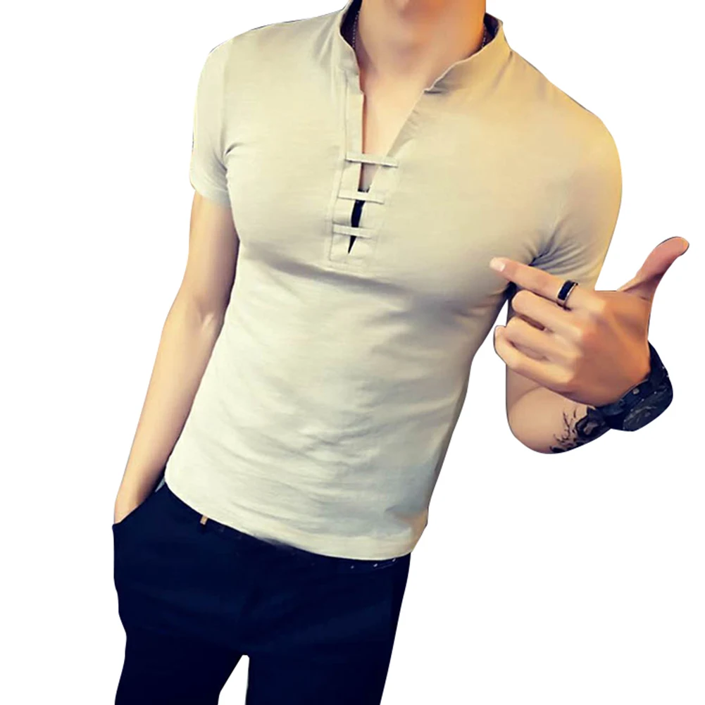 Модная Летняя мужская Однотонная футболка поло с v-образным вырезом и коротким рукавом