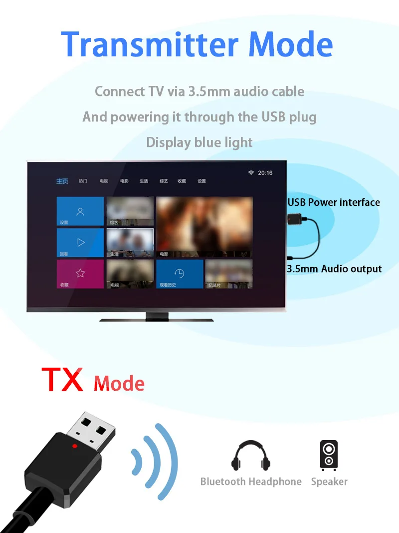 RX mode: Pairing name: ZF-169, find it in the Bluetooth settings of the phone to pair. The blue light flashes during the pairing process, and the blue light stops flashing after the pairing is successful. Connect the product to the audio device with a 3.5 audio cable. TX mode: TX mode will automatically search for other Bluetooth receiving devices (such as Bluetooth headset, Bluetooth speaker, Bluetooth receiver, etc.), the red light flashes during pairing, and the red light stops flashing after pairing succeeds. Connect the product to a device such as a TV with a 3.5 audio cable/RCA audio cable.