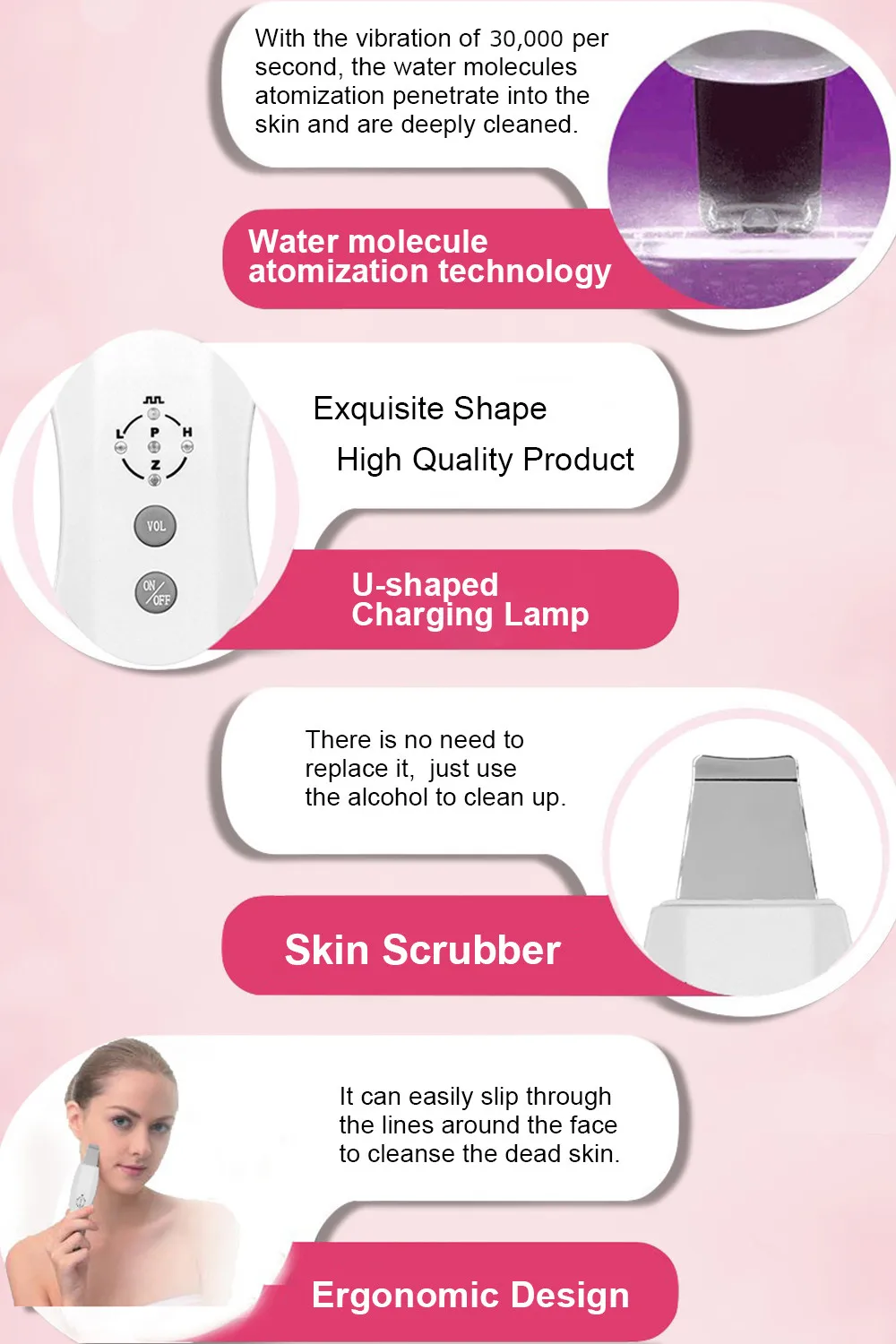 30000 ультразвуковых вибраций в секунду массаж лица, глубоко в поры, очистите кожу от грязи, очиститель кожи, очиститель пор, уменьшение масла, удаление черных точек, удаление акне, длительное использование позволяет сохранить кожу лица чистой и энергичной.