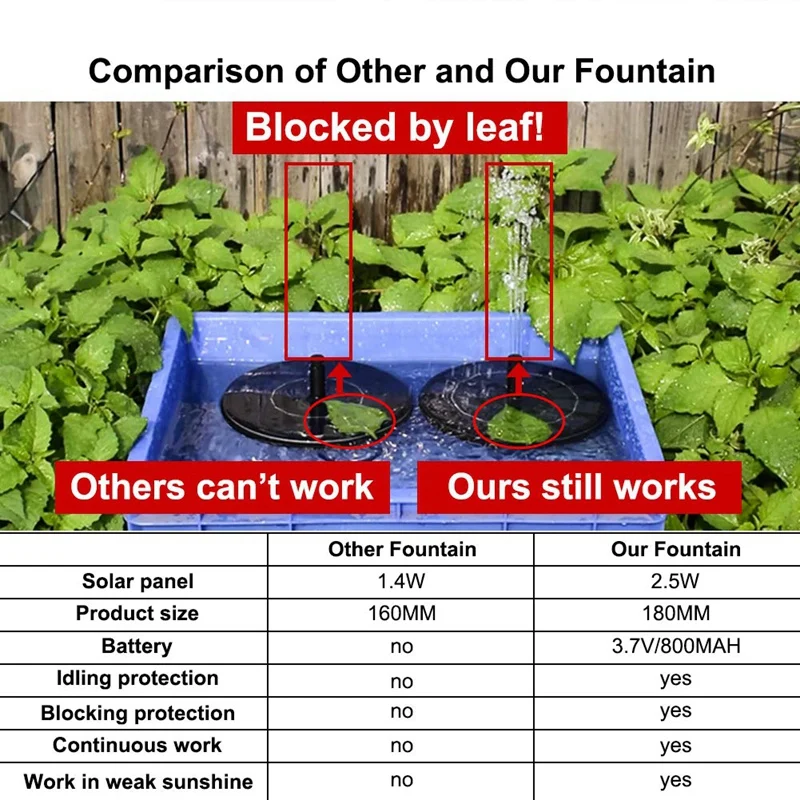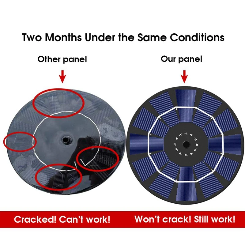 Обновление цепи солнечной панели-даже если солнечная панель заблокирована на 3-4 штуки, наш солнечный фонтан все еще работает с постоянным потоком (другие солнечные фонтаны не будут работать после блокировки). Высококачественная ламинированная солнечная панель-в отличие от других солнечных фонтанов, использованных низкокачественной эпоксидной панелью, мы используем высококачественные солнечные ламинаты, которые не сломаются, не деформируются, расслаиваются и прослужат дольше.