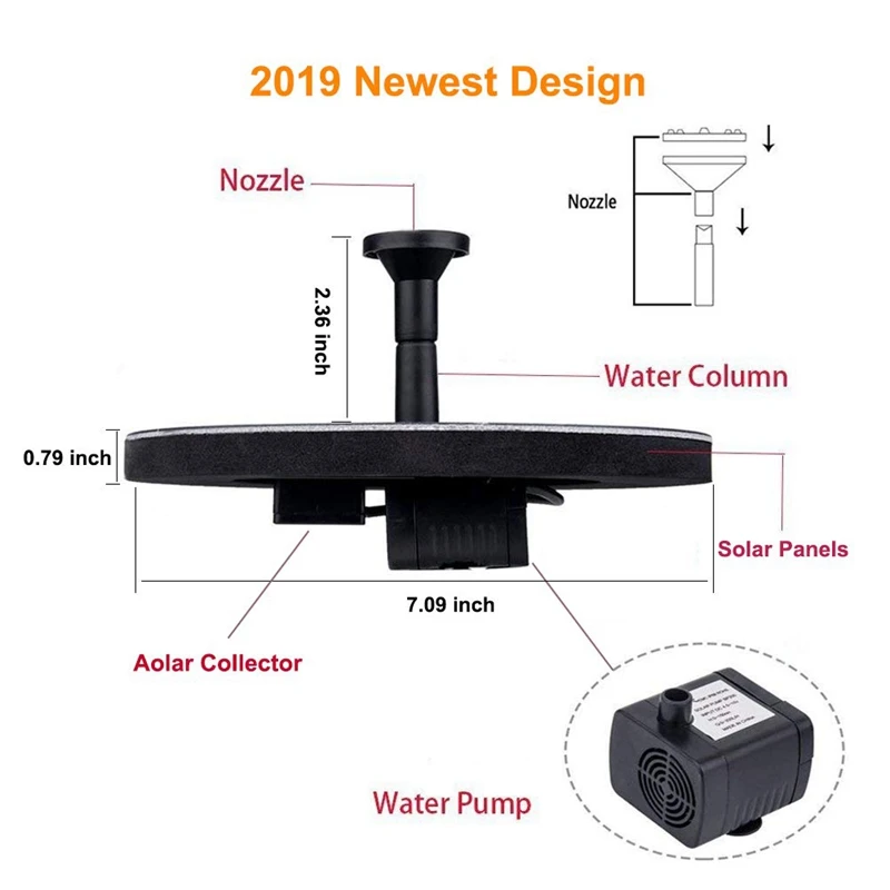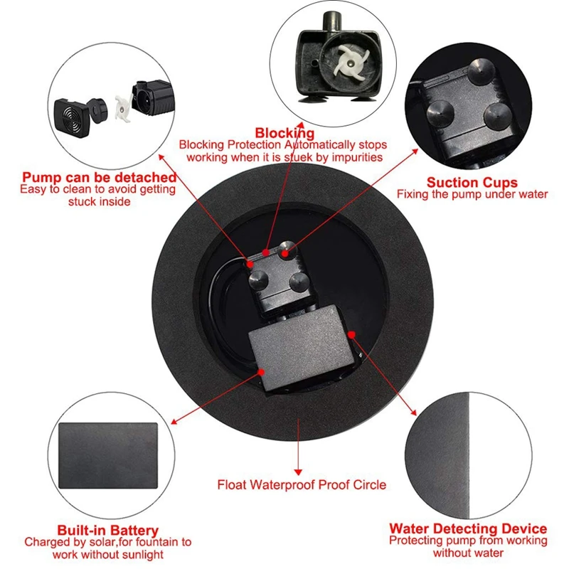 Защита на холостом ходу и блокировка-когда фонтан не находится в воде или насос застревает от примесей, насос автоматически перестанет работать, предотвращает высыхание насоса и вызывает выгорание, и продлить срок службы фонтана. (Когда фонтан не работает, проверьте, находится ли изделие в воде или Разберите насос и очистите его.) Новое обновление солнечной панели