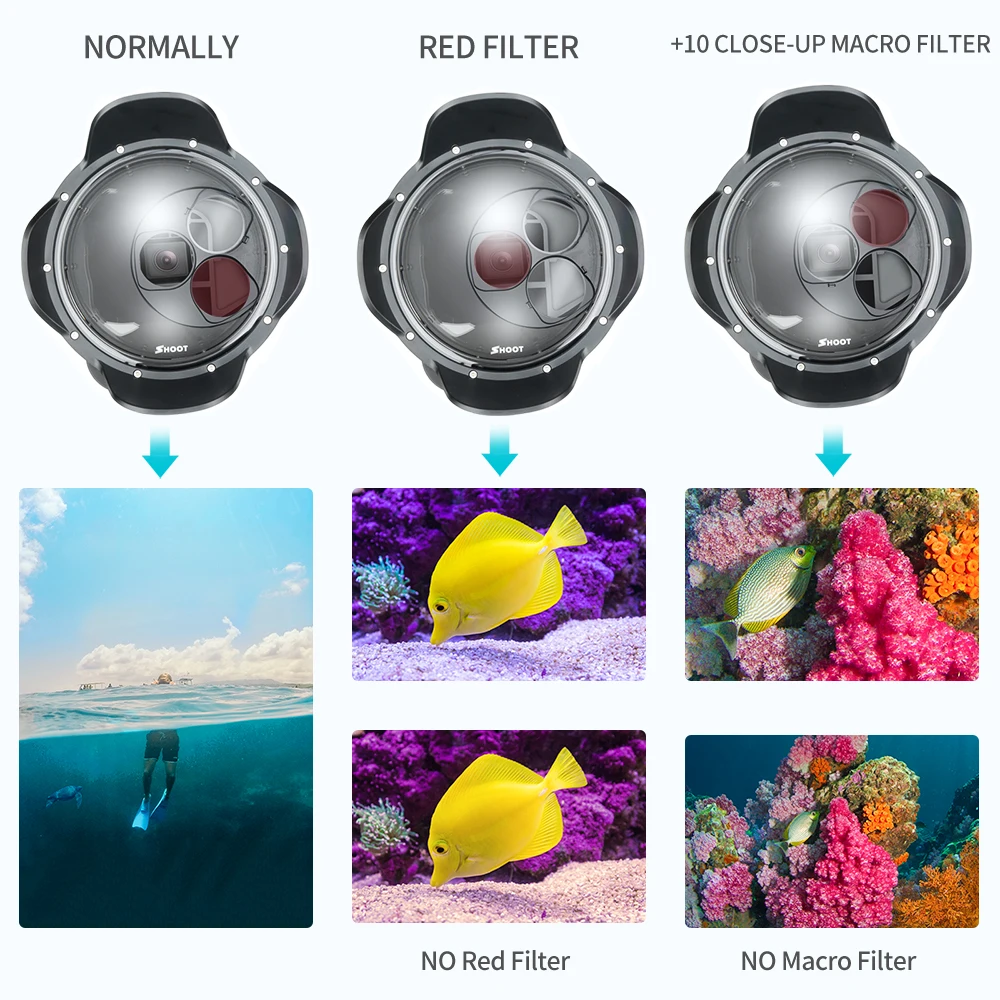 3. Увеличьте функцию Красного фильтра, восстановите цвет морского дна, увеличьте выбор увеличительного стекла, можете снимать маленьких существ на морском дне, способность продукта значительно улучшается, не только половина крышки объектива для воды, он превращается в Рыбий глаз купола короля! Особенности, которые вы хотите использовать, все здесь