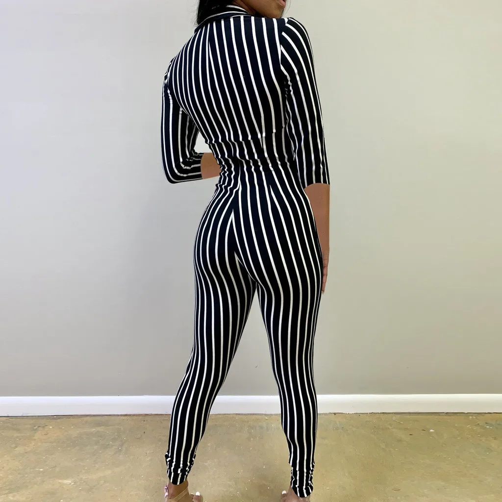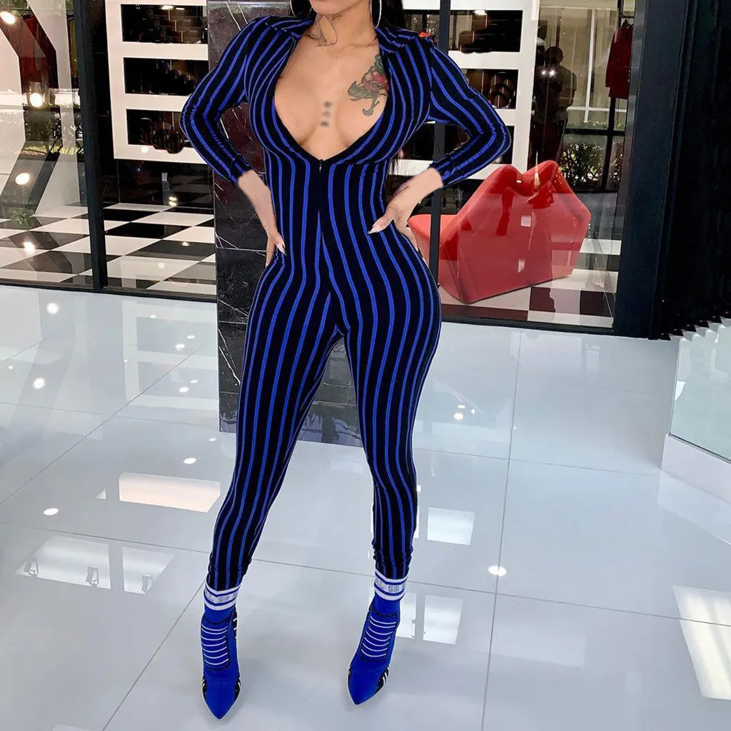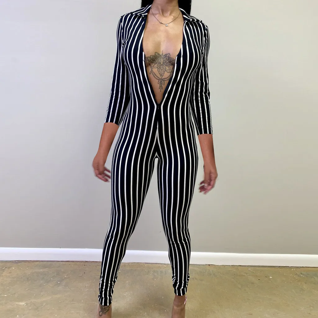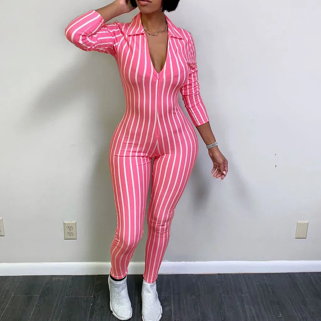2019 Модные женские длинные рукава с v-образным вырезом в полоску с принтом на молнии, обтягивающие сексуальные комбинезоны Outono das Mulheres Rompers Mulheres Y
