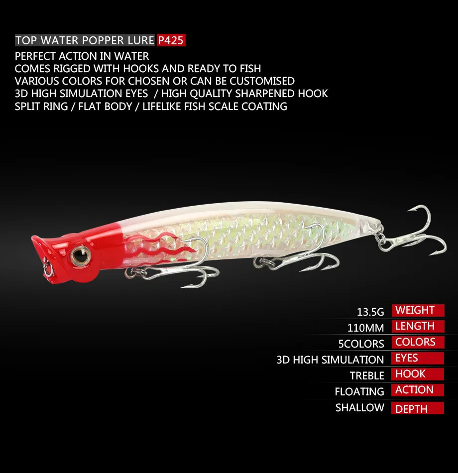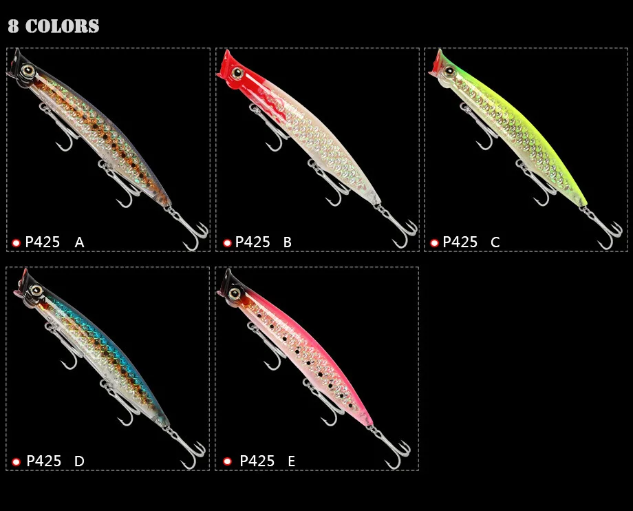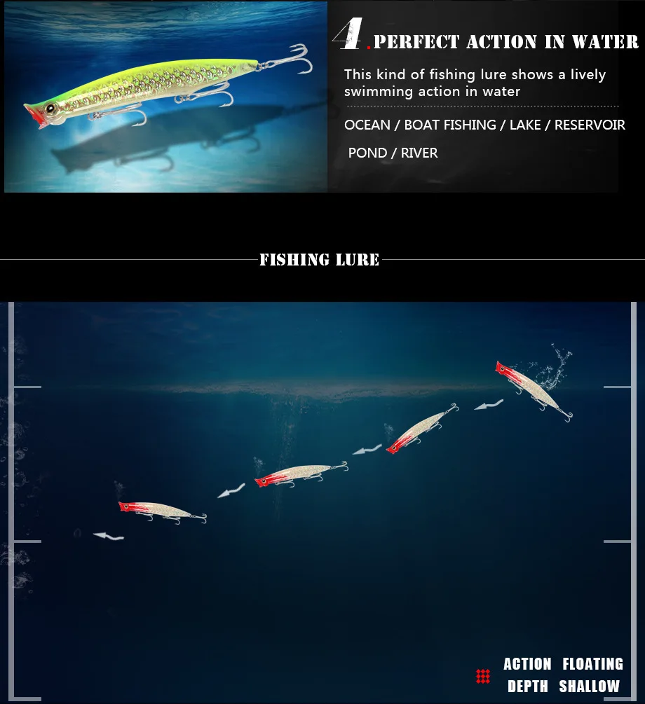 1. Покажите угол наклона с поверхностью воды, эффективно для поверхности рыбы.2. Передовая стерео-лазерная технология усиливает отражение,Создает непреодолимое искушение для крупной игровой рыбы.3. Оснащен тройным крючком vmc (bkk).