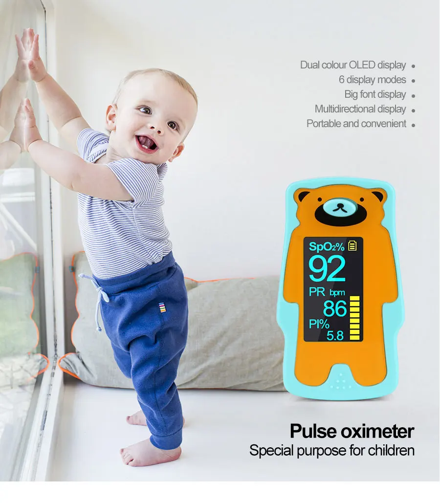Applcation для детей более 4 месяцев 1. Поддержка 6 режимов отображения 2. Двойной Цветной oled-дисплей 3. Легкий и простой в использовании 4. Функция визуального и звукового напоминания 5. Алгоритм внутри 6. Низкая перфузия: 0.3% 7. Защита от движения 8. Отрегулируйте параметры в дружественном меню. 9. Индикатор низкого напряжения батареи 10. Автоматическое выключение при отсутствии сигнала 11. Стандартный два аккумулятора AAA 1,5 В щелочные батареи Поддержка более 20 часов непрерывной работы 12. Защита от брызг воды IP22