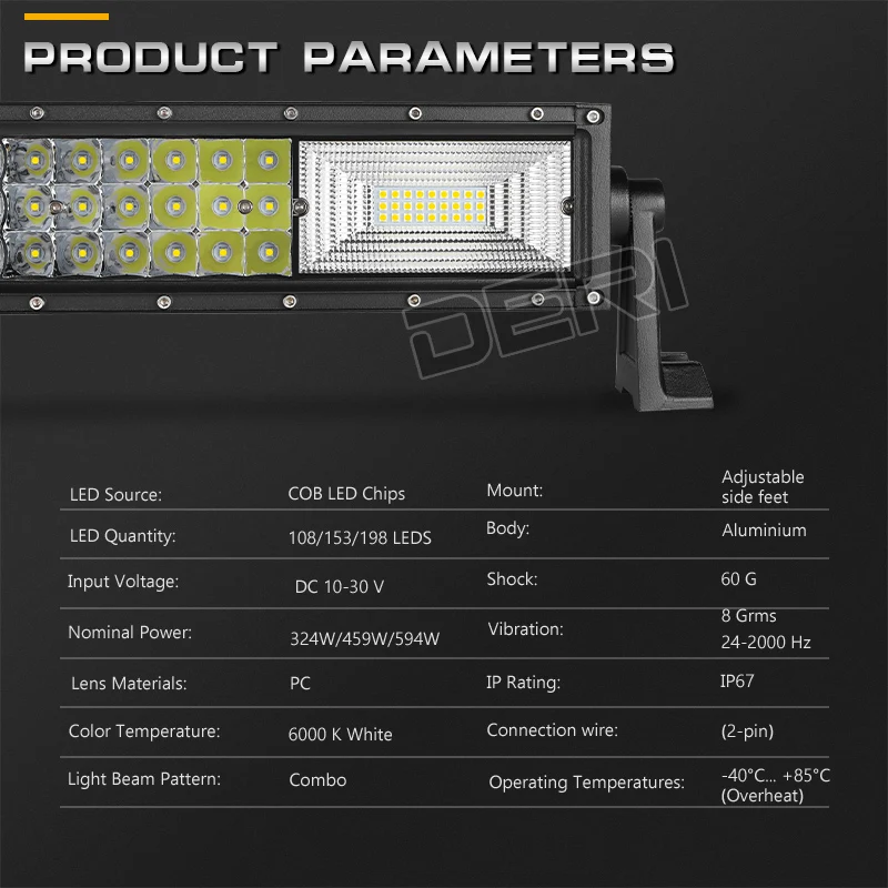 Характеристики:Рабочее напряжение для Светодиодный светильник бар: подходит для автомобиля 12 В/24 ВРабочее напряжение для проводки: 12 ВРабочее напряжение для дистанционного управления: 9-16 ВУгол луча: 30 градусов (точечный луч) и 60 градусов (луч потока) комбоЦветовая температура: чистый белый 6000KРабочая температура:-40-85 градусов ЦельсияВодонепроницаемое и пылезащитное уплотнение IP68, срок службы около 50000 часовМатериал: черный литой алюминиевый профиль, линзы из поликарбоната, прочная подошва