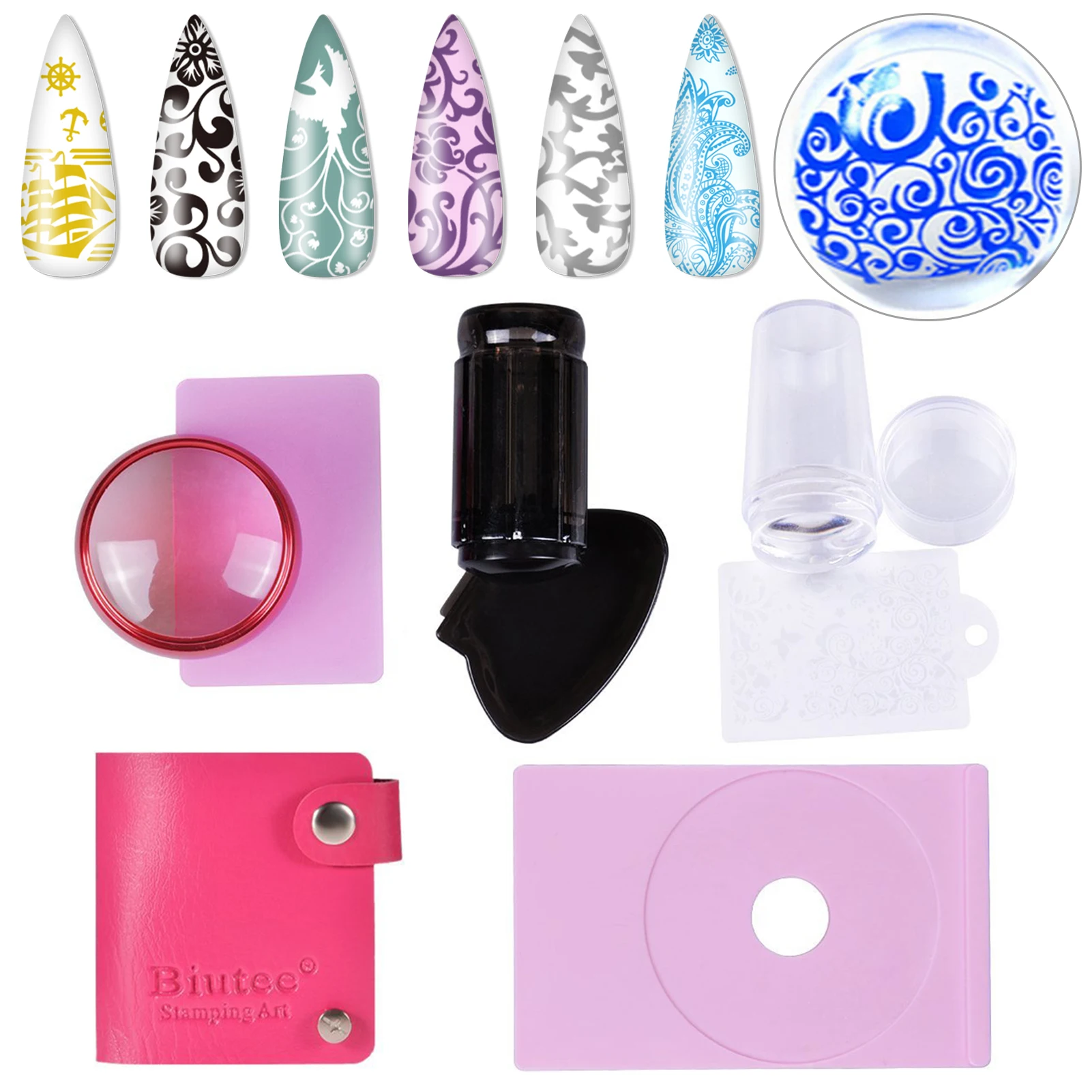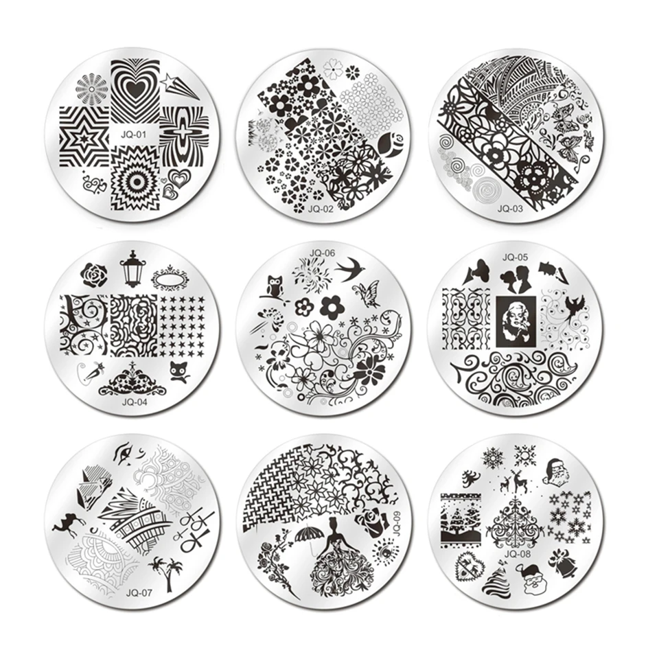 44 шт. в комплекте> Комплектация: 30 шт. ногтевых пластин (6*6 см) около 270 рисунков Набор гелей для стемпинга 8 шт. (8 мл) (фиолетовый/синий/желтый/зеленый/красный/белый/серебристый/черный) Наборы штампов 2 шт. 1 шт. сумка для хранения ногтей Скребки 3 шт 36 шт. в комплекте> Комплектация: 30 шт. ногтевых пластин (6*6 см) около 270 рисунков Наборы штампов 2 шт. 1 шт. сумка для хранения ногтей Скребки 3 шт Как использовать 1) пластины необходимо снять защитную пленку 2) Нанесите лак для стемпинга на нужный дизайн 3) скребком удалите излишки лака с помощью угла 45 ° 4) подберите дизайн с помощью штампа, используя прокатное движение 5) Нанесите штамп на ноготь с помощью движения скатывания 6) Нанесите верхнее покрытие для более длительного результата