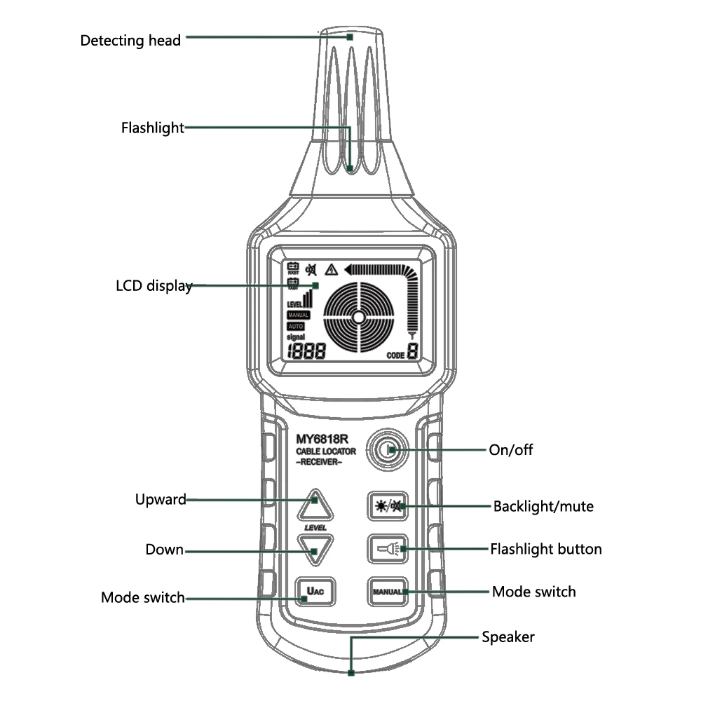 Экран приемника может отображать передающую мощность передатчика, передаваемые коды, энергию передатчиков и его собственных батарей, сигнал, вызванный напряжением переменного тока, обнаруженный и предупреждающий символ напряжения сети.