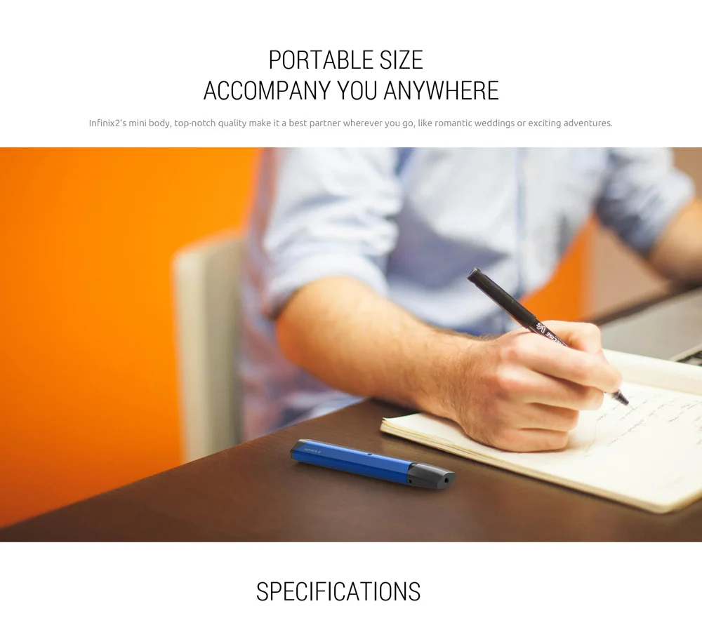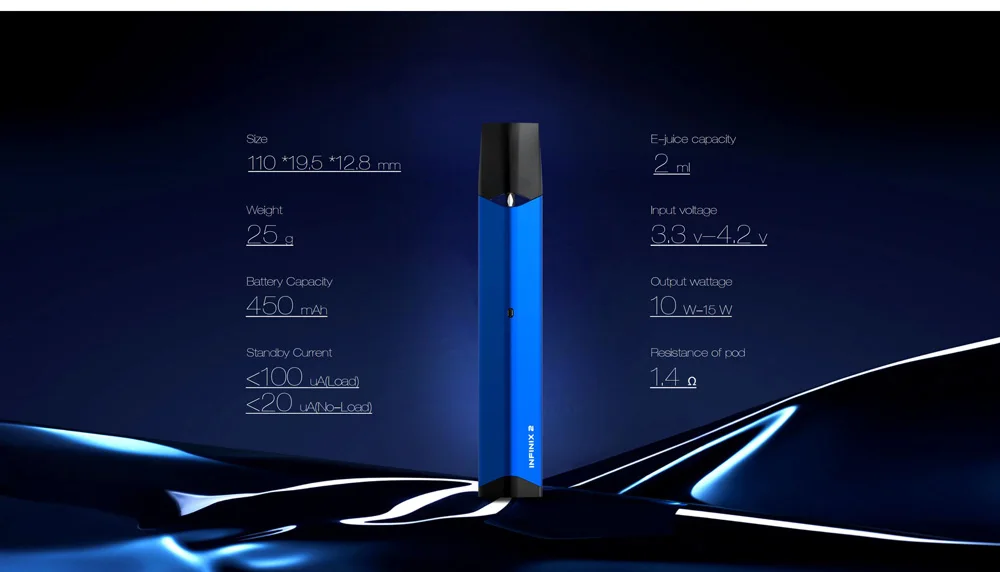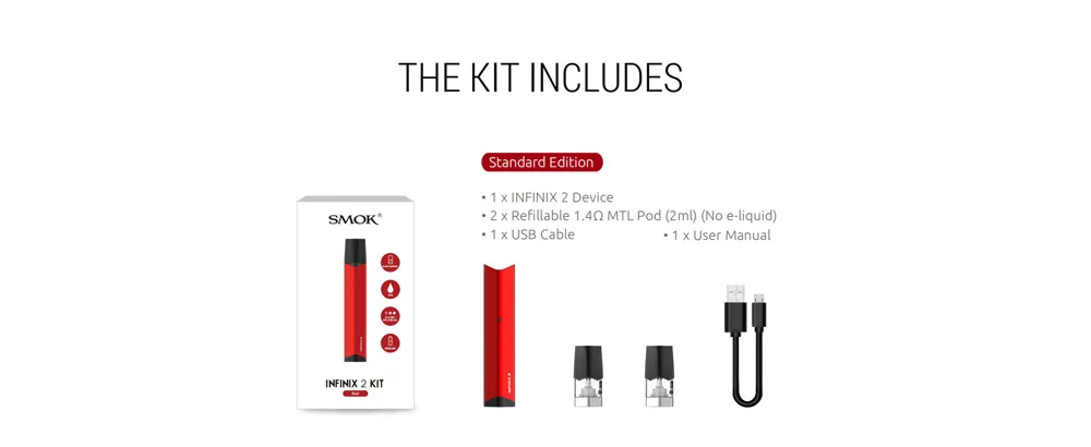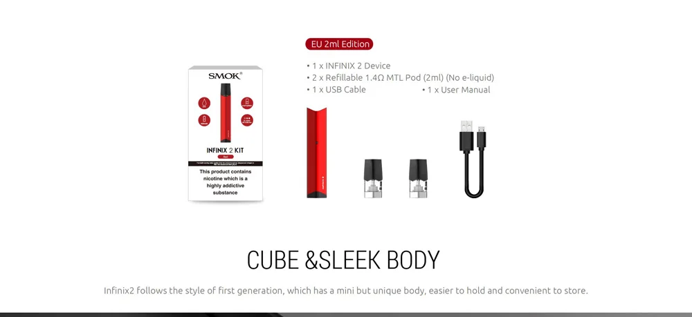 SMok infinix 2 Kit-обновленная версия INFINIX. Он повторяет стиль первого поколения, тонкий и гладкий, что позволяет носить его везде. Работает от встроенного аккумулятора 450 мАч, он может обеспечить более длительное время испарения, чем INFINIX, емкость аккумулятора которого составляет 250 мАч. Эта версия также имеет многоцветный светодиодный индикатор, вы можете четко знать условия устройства в различных цветах. И в комплект входят две стручки, оба из которых имеют емкость 2 мл, вы можете наполнять их электронной жидкостью, которая вам нравится. Нет ключа огня, нет кнопок вверх и вниз, просто вдыхайте вы можете почувствовать удовольствие, предоставляемое infinix 2.