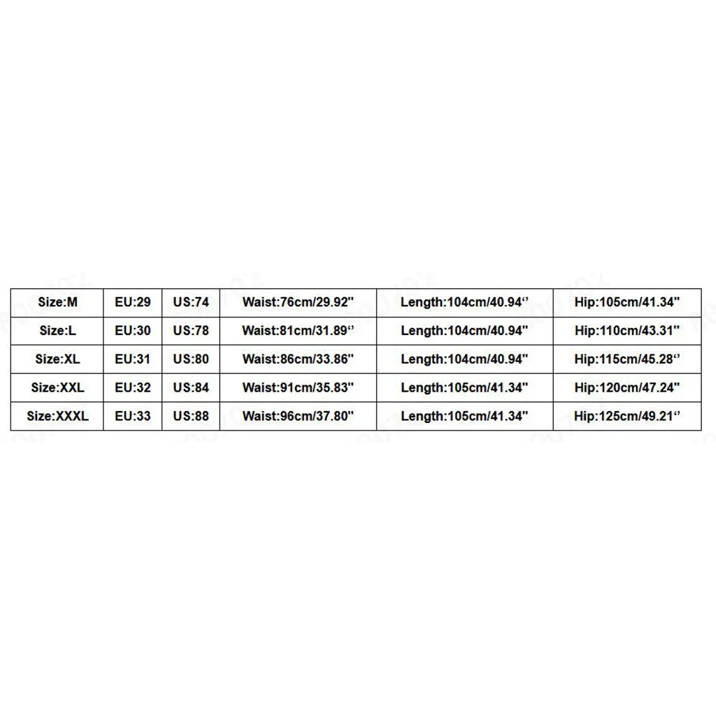 Что вы получаете: 1 х мужские брюки Размер ЕС Свяжитесь с нами Обхват талии Длина Обхват бедер L 29 74 76 см/29,92'' 104 см/40,94'' 105 см/41,34'' XL 30 78 81 см/31,89'' 104 см/40,94'' 110 см/43,31'' XXL 31 80 86 см/33,86'' 104 см/40,94'' 115 см/45,28'' XХХL 32 84 91 см/35,83'' 105 см/41,34'' 120 см/47,24'' XXXXL 33 88 96 см/37,80'' 105 см/41,34'' 125 см/49,21''