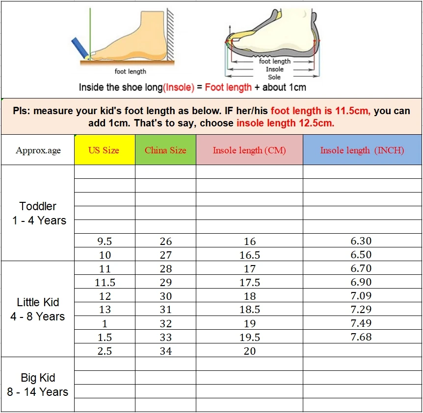 Поскольку все размеры детской обуви отличаются, при заказе детской обуви вы должны соответствовать нашим размерам и внутренней длине.
