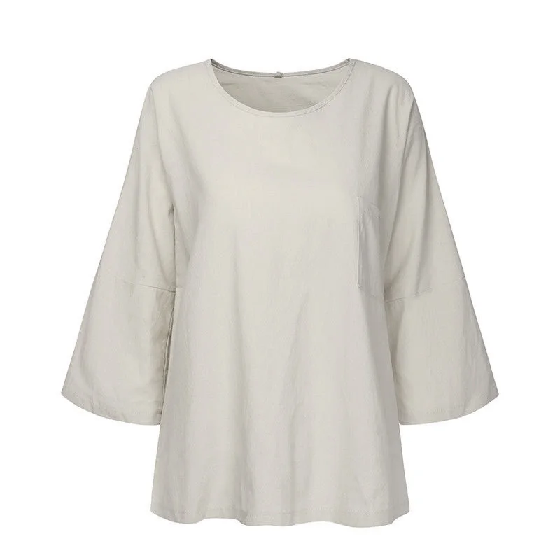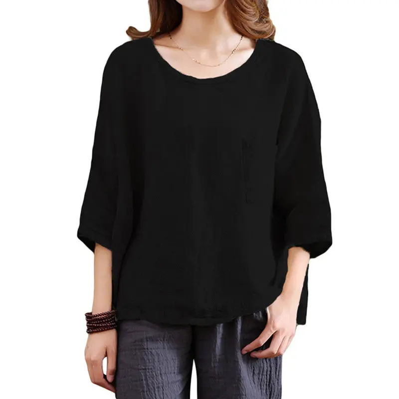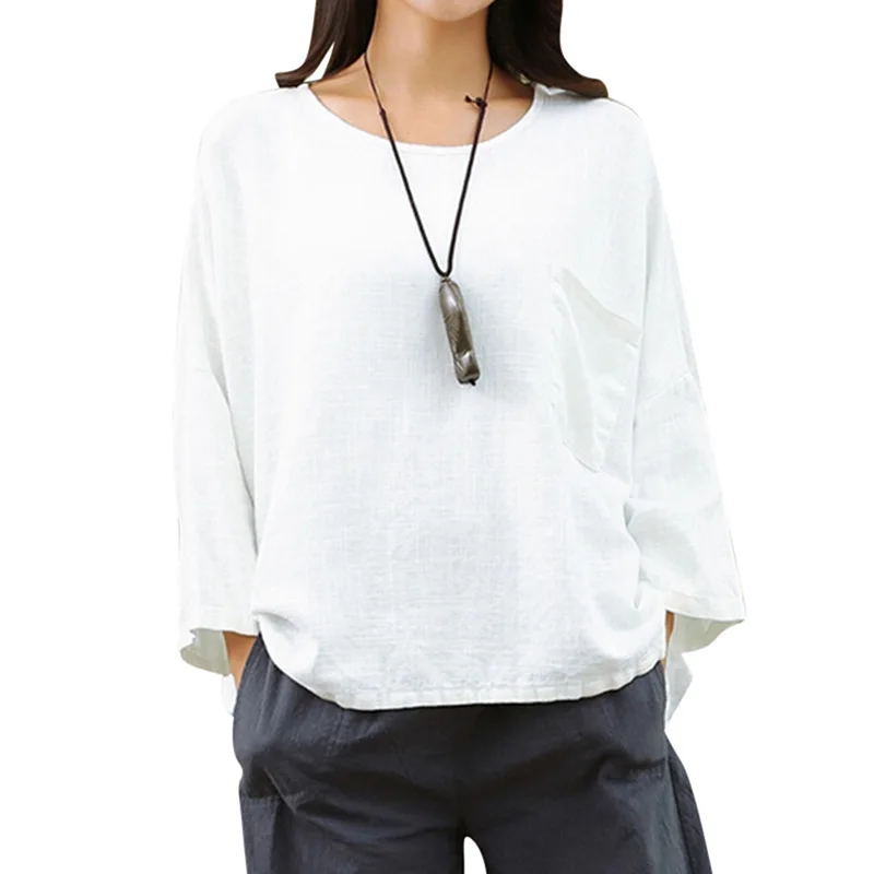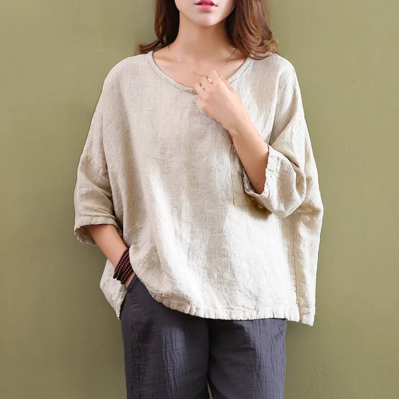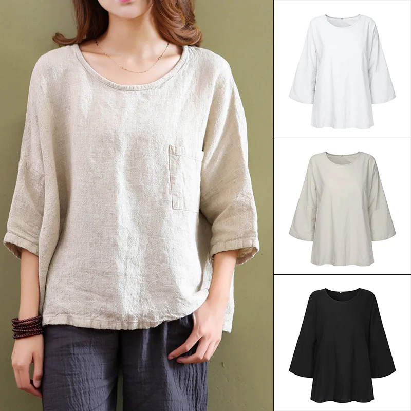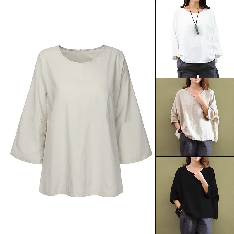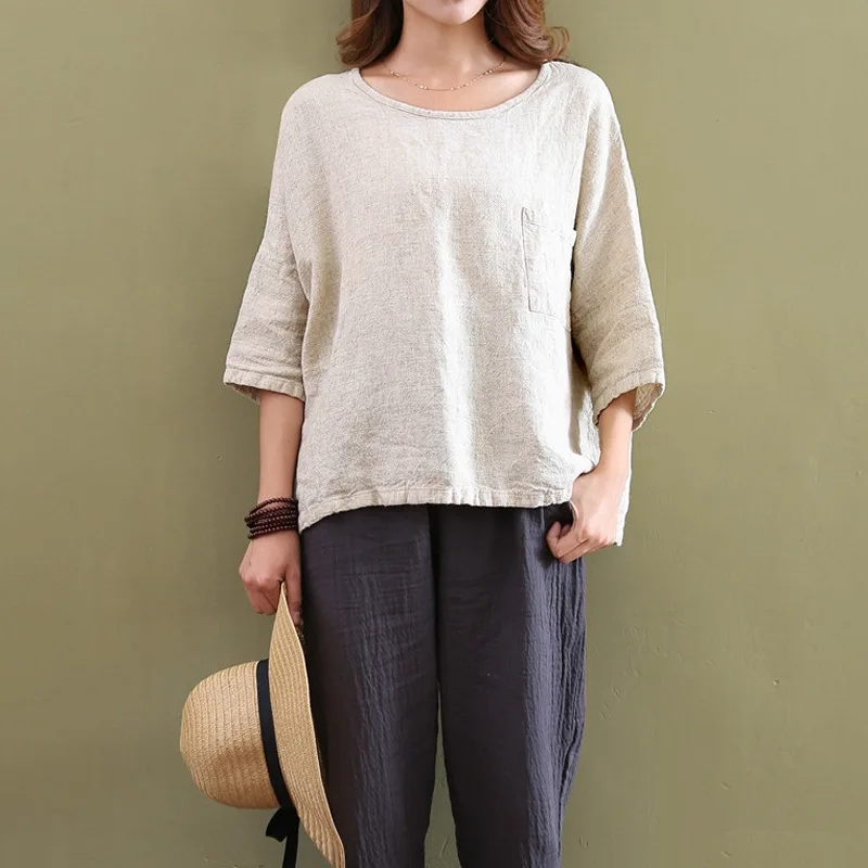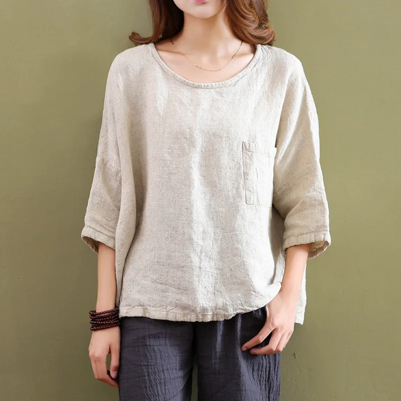 * Описание товара: Женская винтажная льняная свободная туника с рукавом 3/4 и круглым вырезом из хлопка и льна