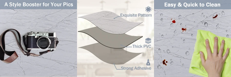 1. Настоящий мраморный вид, придает вам естественный мраморный вид 2. Простота установки, обслуживания и очистки 3. 100% не токсичная ПВХ пленка, безопасная и долговечная в течение многих лет 4. Устойчив к воздействию масла, пыли, воды и защитит и украсит вашу мебель
