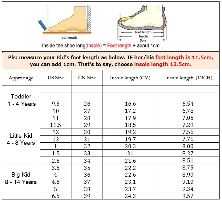 5.Что касается размера, Измерьте длину стопы ребенка в см или дюймах + 1 см или 0,03937 дюймаChВыберите соответствующий американский размер, спасибо