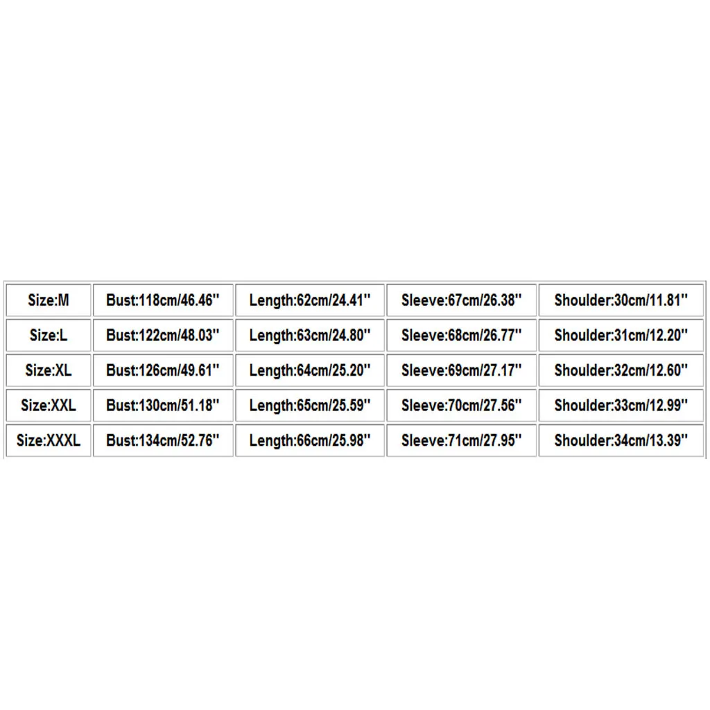 РазмерБюстДлинаРукавПлечоМ118 см/46,46''62 см/24,41''67 см/26,38''30 см/11,81''L122 см/48,03''63 см/24,80''68 см/26,77''31 см/12,20''XL126 см/49,61''64 см/25,20''69 см/27,17''32 см/12,60''XXL130 см/51,18''65 см/25,59''70 см/27,56''33 см/12,99 дюймаXXXL134 см/52,76''66 см/25,98''71 см/27,95''34 см/13,39''