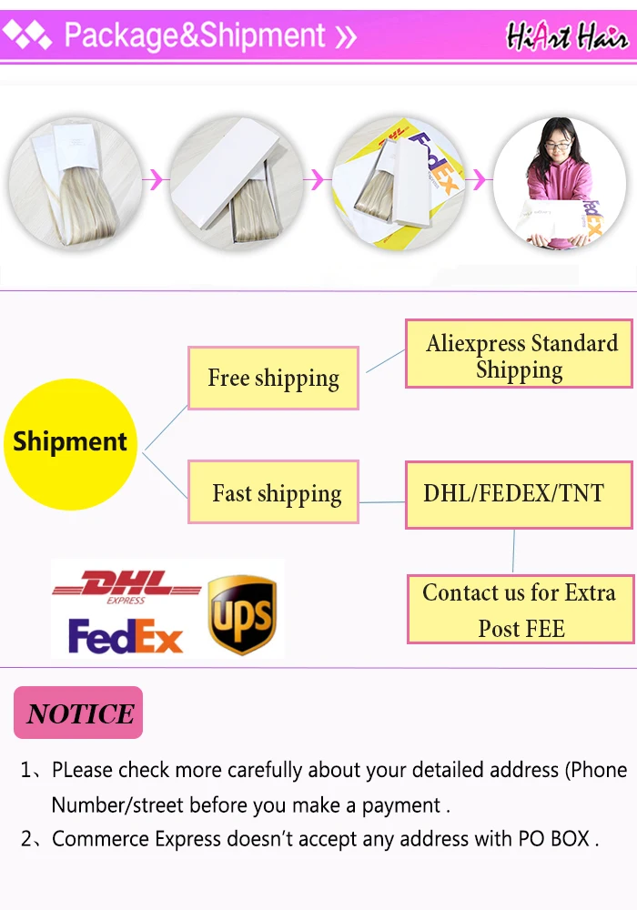 Q: Is that real human hair ? A: Yes, Hiart Official Store focus on 100% real human hair, only collect from health young people. Q:Can your hair be Dyed, Flat ironed, Bleached etc. ? A: Yes ! But please known this is real human hair. Use a heat protectant with any heat tools and take caution when bleaching.Suggest choose a right color directly, that can save your dye time.Bleaching the hair may cause a small amount thermal loosening to the curl pattern. Always see a professional for any color treatments. Q: How to wash my hair extensions ? A: Like wash your own hair, use mild Shampoo please. Suggest 1 - 2 times washing per week. We also recommend using a hair treatment on them every few weeks, because the hair is not attached to your scalp, it is not getting the oils it should be .It is best to let your hair extensions dry naturally after washing them. Q. What kind of hair care products should I use? A: Treat this hair as if it were your own hair. 1. Use good quality shampoo and hair conditioner to care for hair. It is important to keep the hair soft and shiny. 2. You can use gel or styling products to maintain hair style. 3. Olive oil will be a good option to keep hair healthy. Q: Why the hair extensions getting tangled ? A: The hair tangle because of dryness, oil, dirt build-up, salt water, chlorine, or wrong combing method, high temperature iron on the hair also easy cause the hair tangle. Suggest wash your hair 1 - 2 times per week, Use wide tooth comb on the hair too, Or consult your stylist for more help you can Q: What is Remy hair? A: Remy hair is considered the best quality of human hair because the cuticles are kept intact and not stripped, as in most non-Remy hair extensions. Preserving hair cuticles and aligning them unidirectionally creates extensions that are completely natural in appearance. This process ensures that the hair stays super soft, shiny, free in all its life. Remy hair looks smoother and healthier than normal human hair. Q: How to tell human hair with synthetic hair? A: Human hair has natural proteins, it is easy to say burning and smelling, human hair will be ash, it will go away after it is punctured, human hair smells bad when it burns, human hair will show white smoke. While the synthetic hair will be a sticky ball after burning and will show black smoke, in addition, the human hair can have few gray hair and a split end, it is normal and not a quality problem. Q: About shopping experience? A:HiArt Official Store aim to provide the best consumer service ,when you have any question ,please feel free to contact us ,we will help you solve this problem ASAP. If you are satisfied with our product/service ,we will appericiate it if you can leave 5 star and Positive Feedback .Yours review is the biggest encouragement for us .Or if you meet some problem ,please don't open a dispute or leave a nagitive feedback,Please Contact us ,we will try our best to help you solve it at the first time(within 24 hours). Q: Can you do constomer made ? A:Yes! HiArt Official Store have own 20 Years experience factory,If you want more colors ,please contact us in aliexpress . Q:If I want to know more information or cooperation,what should I do? A:Welcome talk with us on line or leave a message. Also sending us e-mail.We will reply your messages within 24 hours in working day.