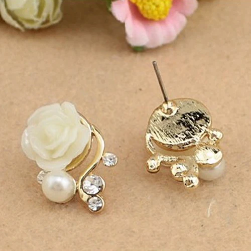 Серьги-гвоздики в форме розы, стразы и искусственный жемчуг.
