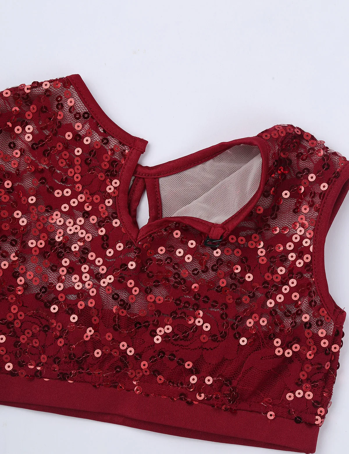 Без рукавов, круглый вырез с застежкой. Укороченный топ из кружева с пайетками на подкладке с декоративным вырезом спереди и сзади.