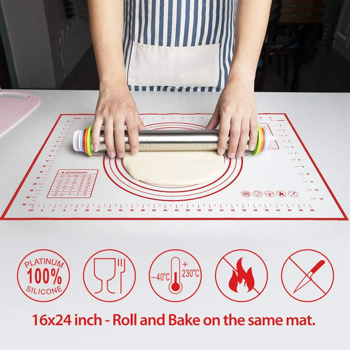 Силиконовый материал, Нескользящая липкая, легко моется, жаростойкая выпечка, подходит для производства выпечки. Ультра-тонкий с антипригарным покрытием и Ноэ устраняет скольжение. Легко хранить, закатывать и помещать обратно в трубку. Легко чистить в теплой мыльной воде. Двойная шкала легко захватывает Размер пищи. Ваше время выпечки с теплой домашней жизнью. Делает и отличный подарок для тех, кто любит выпечку или заинтересован в начале! Идеально подходит для выпечки хлеба, печенья, выпечки, а также для приготовления вареного сахара и шоколада.