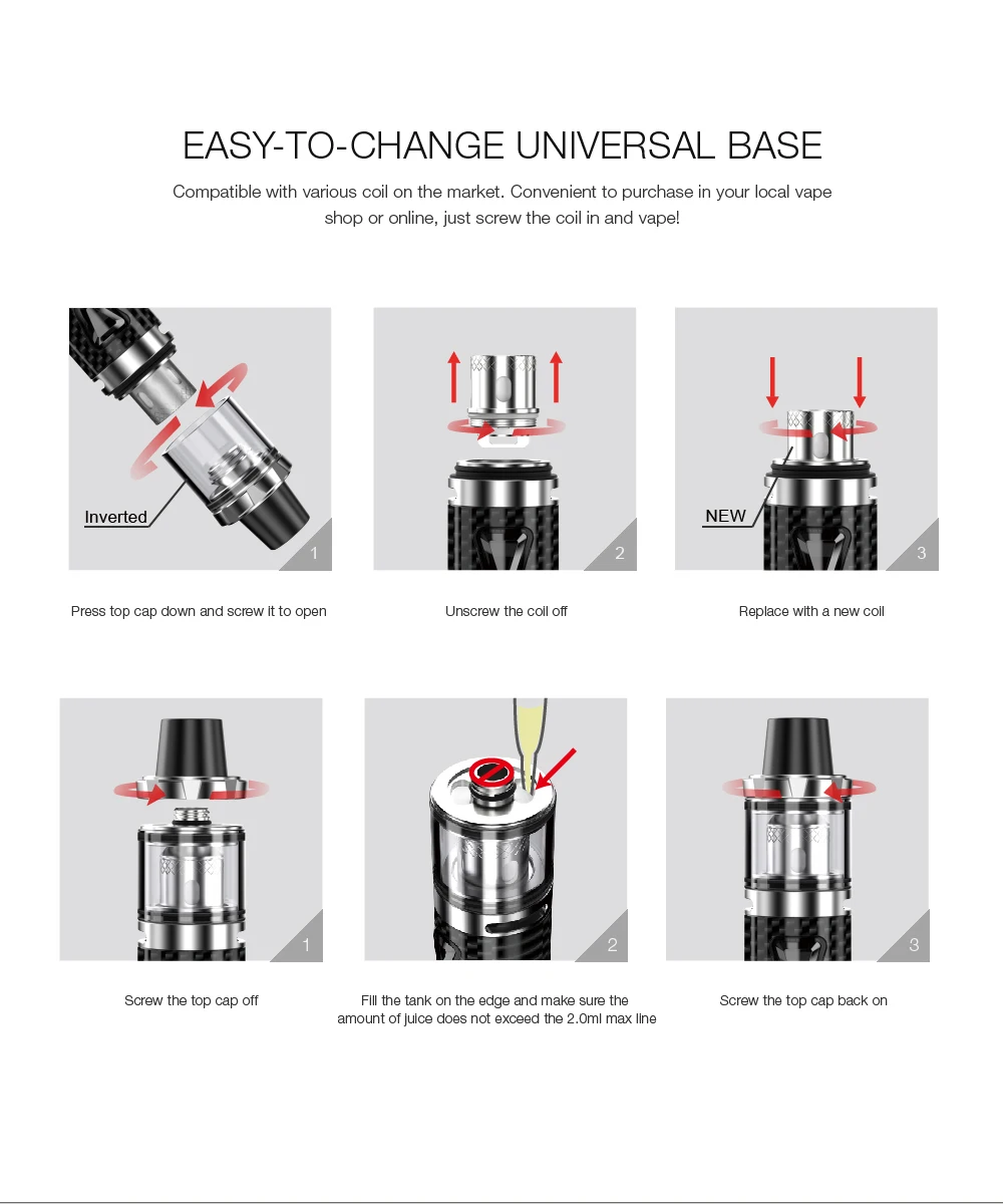 Особенности Встроенный аккумулятор 2200 мАч с максимальным выходом 50 Вт Удобный портативный дизайн в виде ручки с элегантной отделкой из углеродного волокна Различные цветные светодиоды уровня заряда батареи с различной защитой Магнитная гигиеническая крышка с капельным наконечником с отверстиями для воздушного потока Frogman X2 универсальные базовые катушки с массивным производством пара Легкий топ заправка дизайн с емкостью 2 мл e-juice Упаковочный лист • 1 комплект Solo F2 • 2x-амфибия X2 025ohm NiCr • 1x Стекло трубки • 1x USB кабель • 1x Руководство пользователя