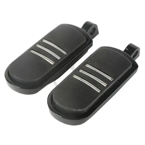 This set of foot pegs features rubber pads inlaid into the frame with three small lines running the width of the peg and left open to expose the chrome surface below